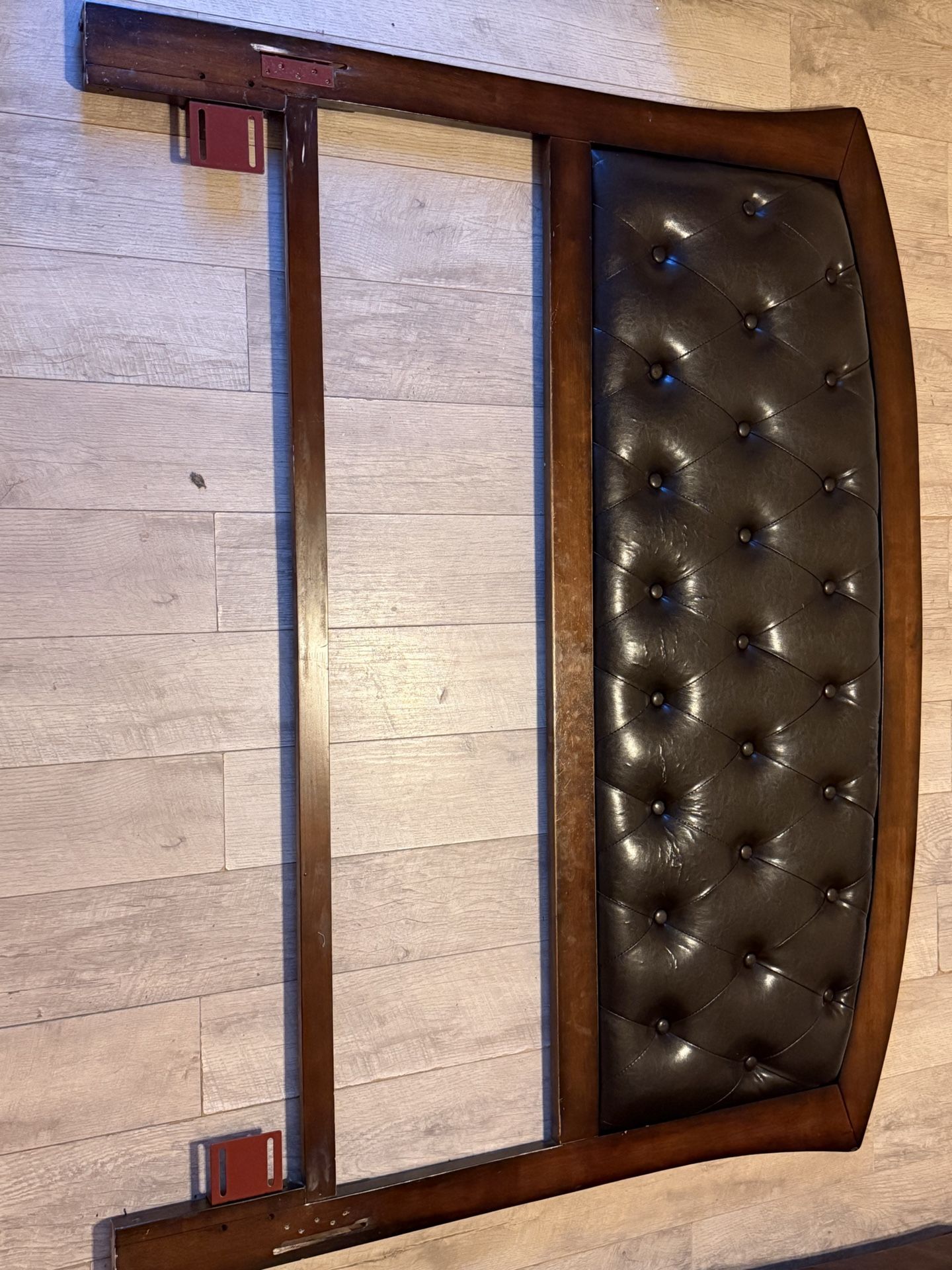 Beautiful queen-size bed set for sale, including headboard, footboard, and side rails. This is a sturdy, well-built frame made of solid wood with a rich dark finish and an elegant tufted leather (or faux leather) padded headboard and footboard for a classic, upscale look. Details: • Fits a queen size mattress • Includes: headboard, footboard, and frame rails • Solid wood construction – very sturdy • Dark wood finish with button-tufted padding • Traditional / classic style that works great in most bedrooms Condition: Good used condition. Normal cosmetic wear from regular use (minor scuffs/scratches as shown in photos), but structurally solid and fully functional. Mattress not included. Great option if you want a high-quality bed frame without paying retail prices. Pickup only.
