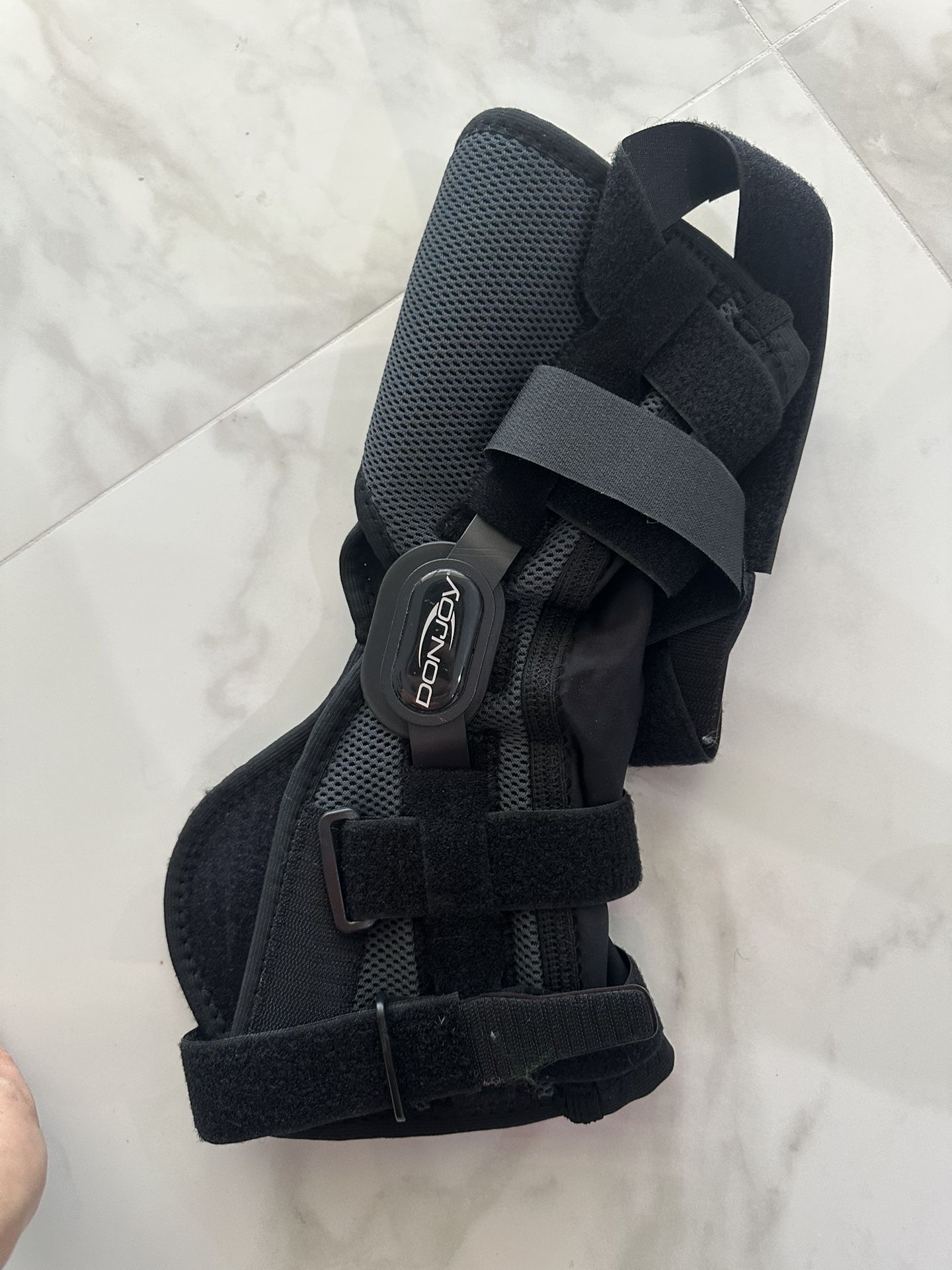 The item is a DonJoy Playmaker Knee Brace, designed to support and protect the knee from mild to moderate ligament injuries.