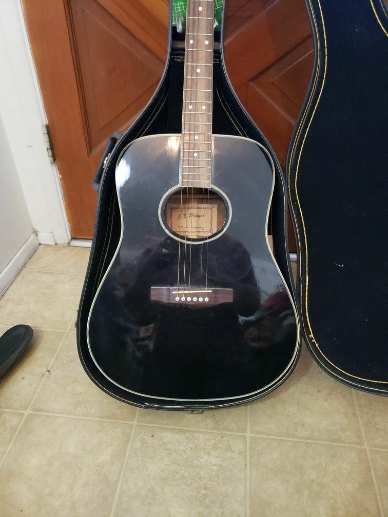 Black 6 string acoustic guitar missing a string. Has not been played for a very long time. Comes with guutar case and a lesson book.