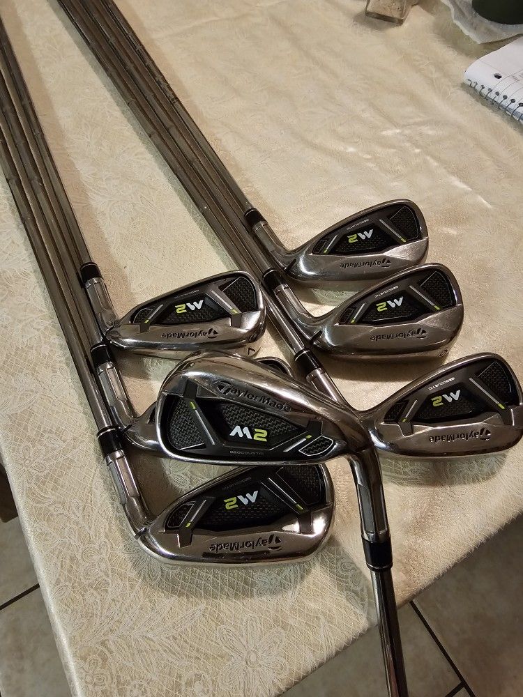 This is a set of Taylormade M2 irons 4 through pitching wedge with x stiff steel shafts. Key features and technology: Distance & Ball Speed: They feature a thin, flexible face with Inverted Cone Technology (ICT) and an Ultra-Thin Speed Pocket in the 4 through 7 irons. This combination is engineered to increase ball speed across the face, especially on strikes hit low, helping to maximize distance. High Launch & Forgiveness (Low CG): To achieve a high peak trajectory for better stopping power, TaylorMade utilized a 360° Undercut and a Fluted Hosel design. These elements work together to remove and redistribute discretionary weight low and deep in the clubhead, lowering the center of gravity (CG). Sound and Feel: The M2 irons employed Geocoustic Engineering and a multi-material 3D Sound Management System badge to control vibration and tune the sound of impact. This is a awesome set of golf club irons!