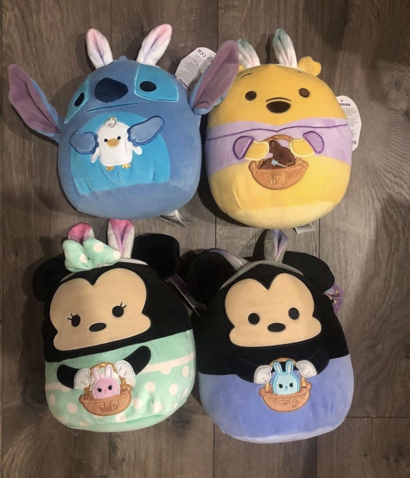 Lot of 4 Squishmallow 8” Easter Mickey, Minnie, Winnie the Pooh and Stitch.