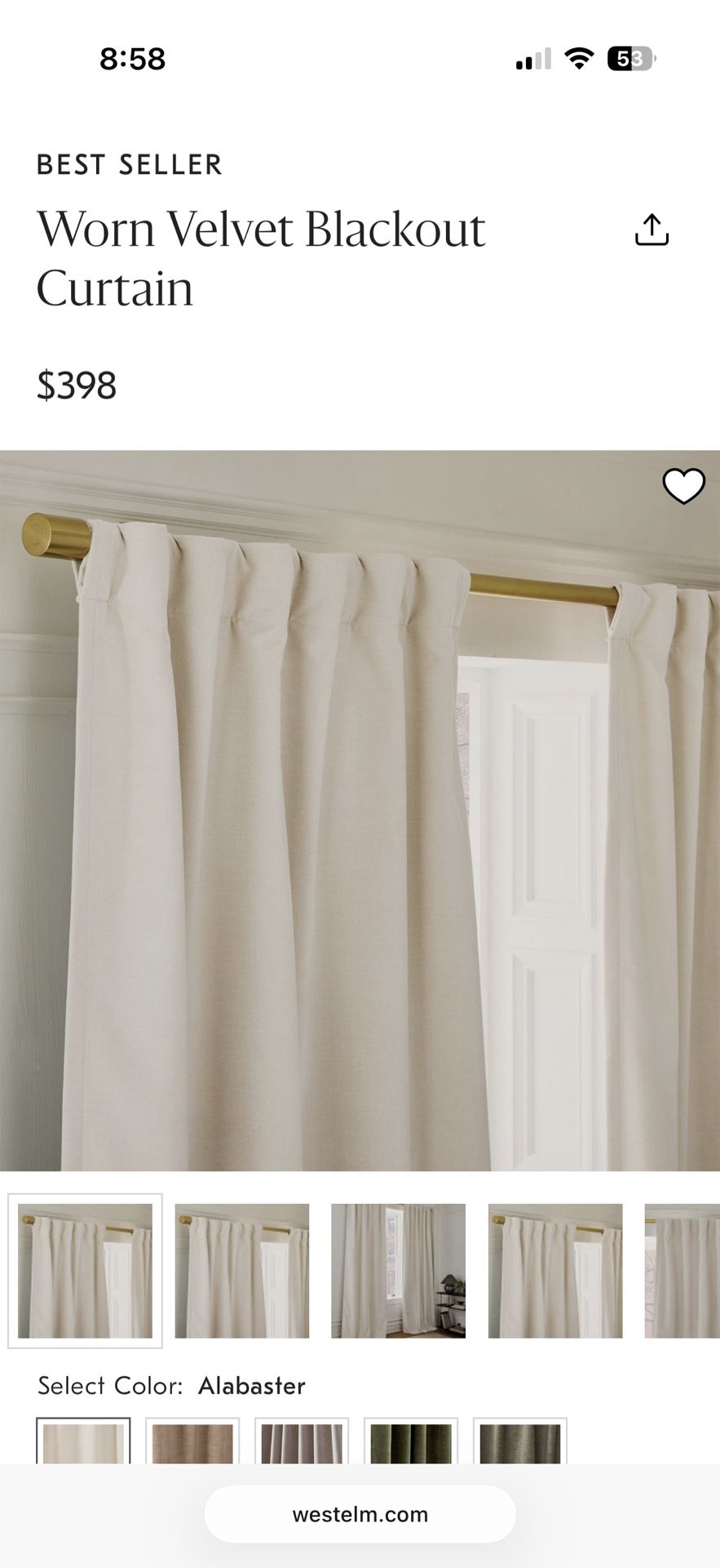 2 panels, each 48”x108” Worn Velvet Blackout West Elm Curtains in the color Alabaster. Has minor markings towards bottom of the lining which is on the back anyways so you can’t see it but I’m mentioning it regardless. I’m also selling the matching gold curtain rod and also matching gold tiebacks.