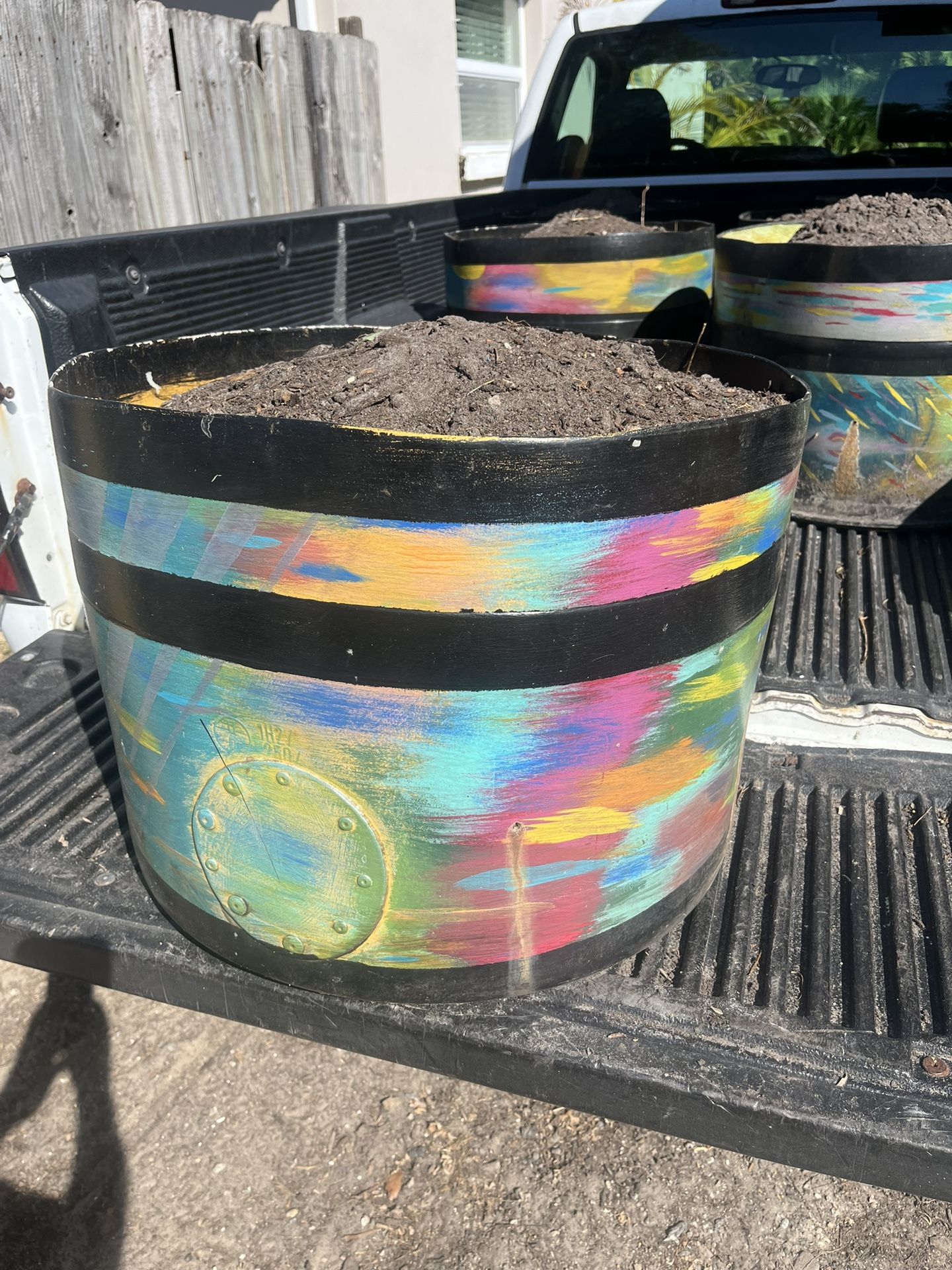 Large heavy duty plastic flower/plant pots. Hand painted. Only $10 each