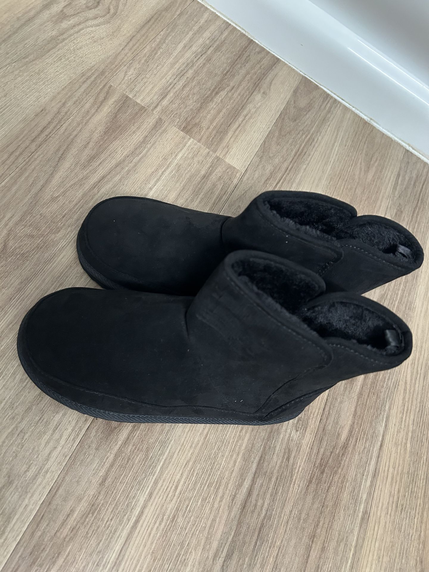 Warm and comfortable black winter boots Perfect for everyday wear during colder weather. • Soft fleece lining inside • Easy slip-on style • Lightweight and comfortable • Neutral black color – matches everything Condition: good, gently used