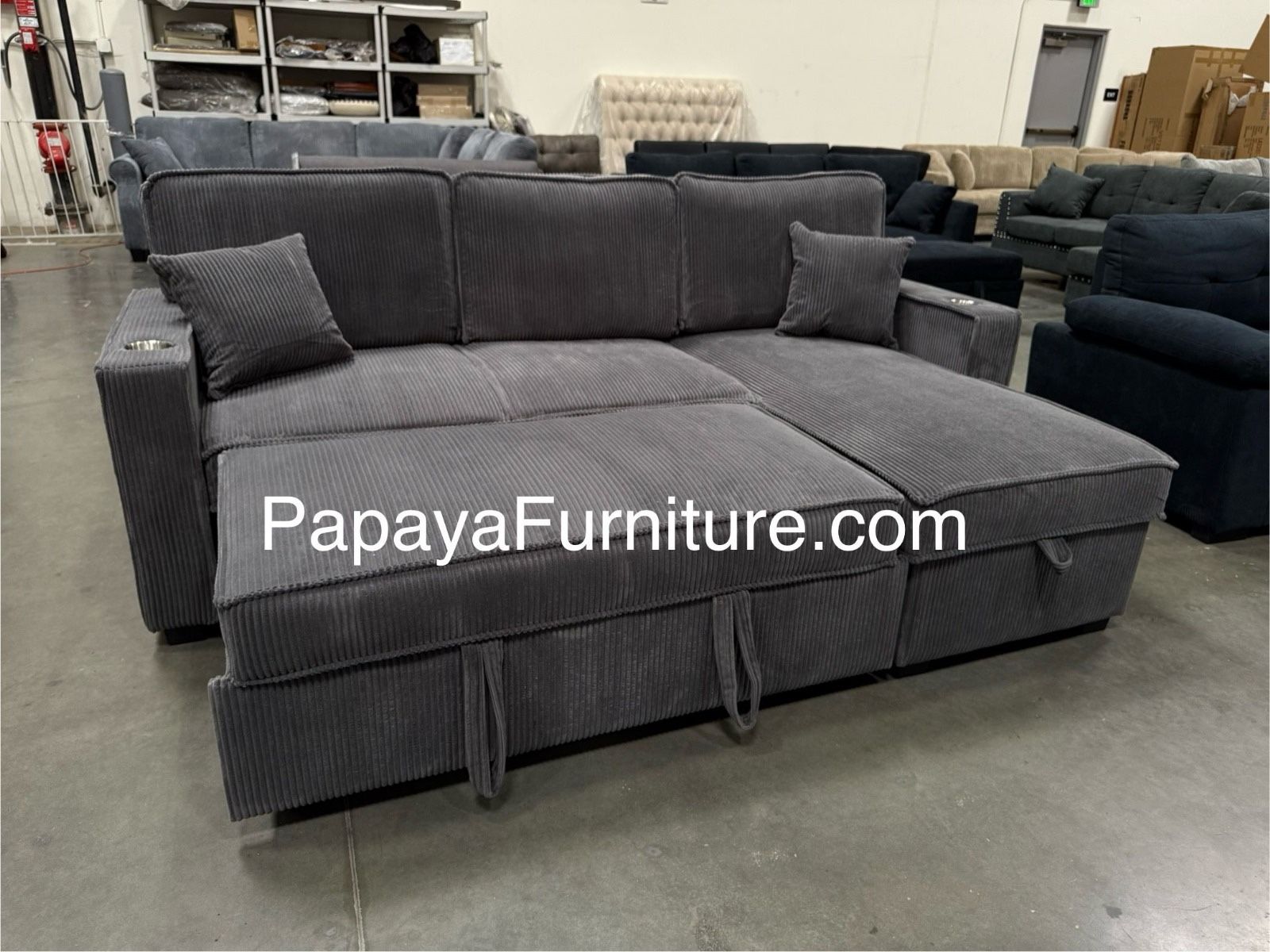 New! Reversible Sectional Sofa Bed, Sofabed, Reversible Sectional sofa With Pull-out Bed, Sectionals, Couch, Small Living Room Sofa, Sleeper Sofa, Sectionals. Enjoy the convenience of a multi-functional piece that adapts to your needs. Featuring a Reversible Chaise Lounge conveniently reverses to fit perfectly into any living room configuration. Package includes: 1 of Sectional Sofa Dimension: Overall: 89" x 59" x 36"H Sofa w/ Cup Holder: 56" x 34" x 36"H Reversible L/R Chaise w/ Storage and Cup Holder: 33" x 59" x 36"H Material: Corduroy 8543