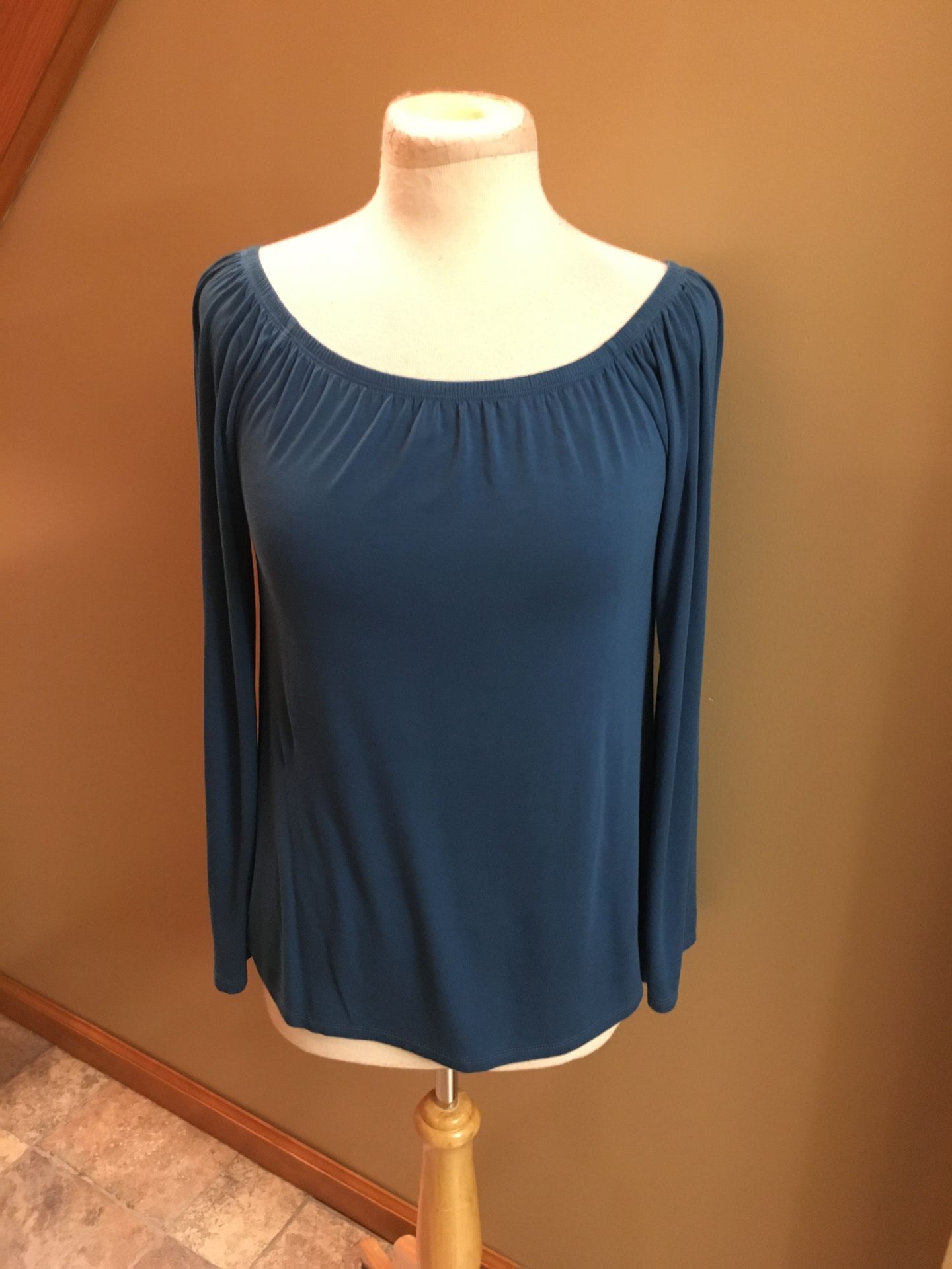 NEW - NEVER WORN, tags were removed but was never worn. White House Black Market teal blue blouse with long sleeves and elastic neckline, you can wear it regularly or off the shoulders 34” chest 24.5” length