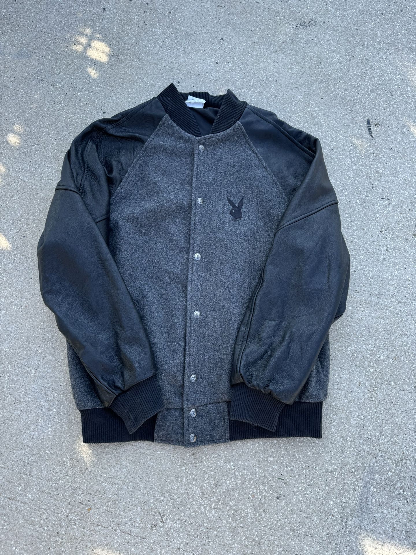 PLAYBOY VARSITY LEATHER WOOL JACKET VINTAGE RARE BLACK GREY BUNNY