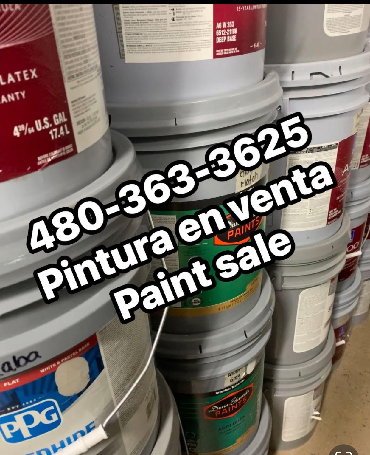 **480@363@3625**☎️ Llámame para más Información sobre colores y precios Pintura para Casas, trailas y bardas en diferentes tonos y precios Interior y exterior Tape, papel, caulking, rodos, brochas, sprayer tips, rags para limpiar, lijas, plástico, LOXON, Quick Dry stain blocking, PVA, flat semigloss y mucho más BRAND New paint buckets for ceilings and walls ⛔️DIFFERENT PRICES ALL DEPENDING ABOUT WHAT YOU NEED.
