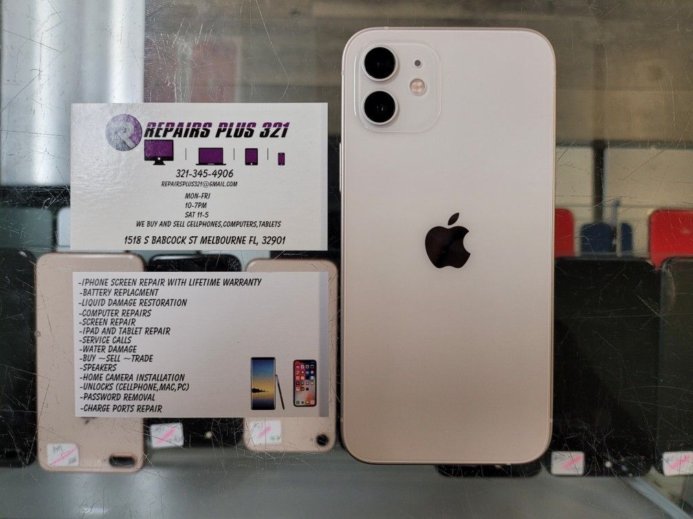 We have an unlocked White iPhone 12 64gb for sale! It comes with a 60 Day Warranty! Charger included! We offer financing and we even give you a chance to extend the warranty to one year! Come Visit Repairs Plus 321! We have many other iPhones, Samsung, Macbooks, and Apple Watches for sale!