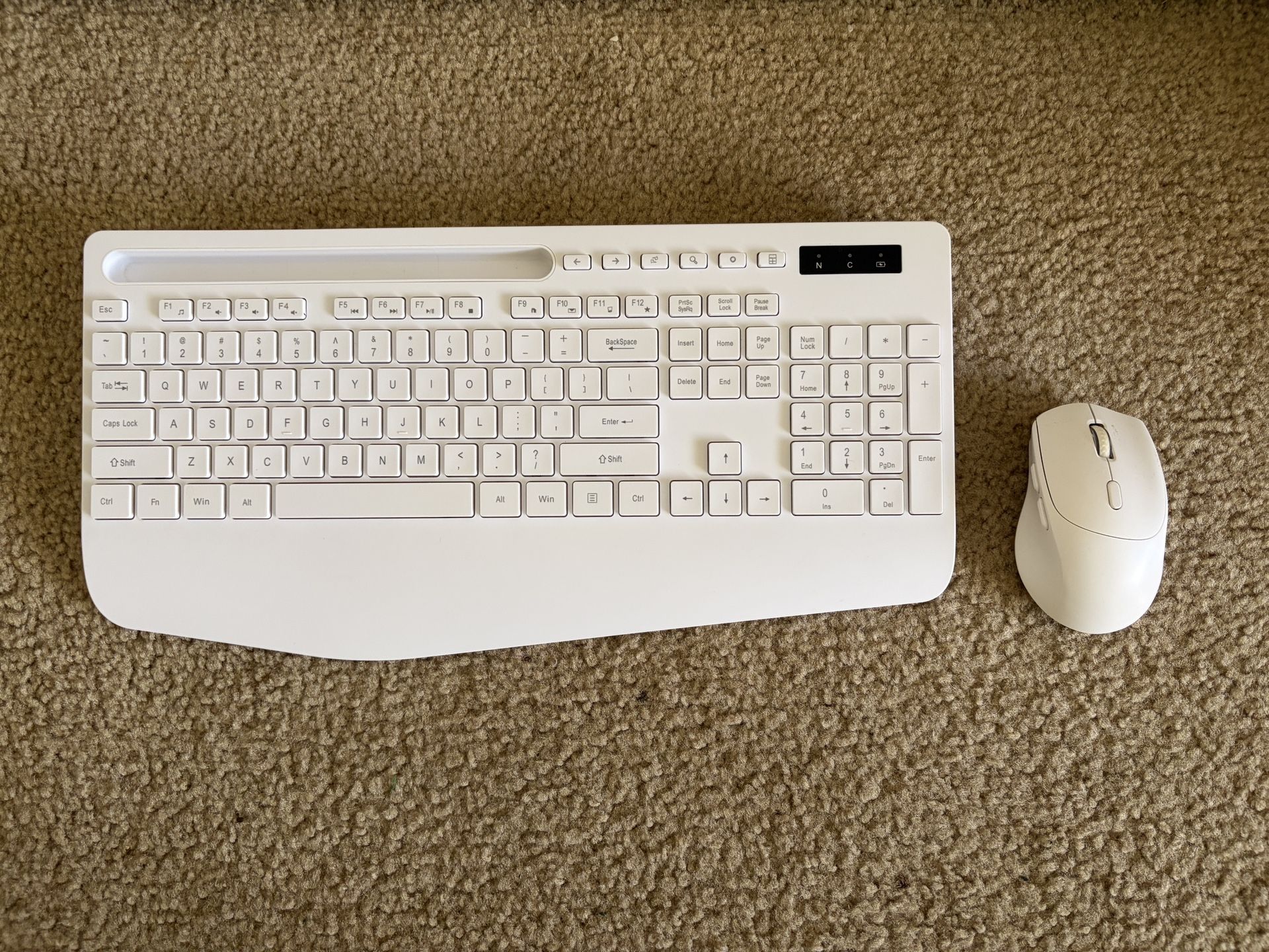Color: White Features: Full size ergonomic keyboard with hand rest, phone holder. Wirelessly connected silent 2.4GHz cordless mouse Compatibility: PC, Mac, Windows