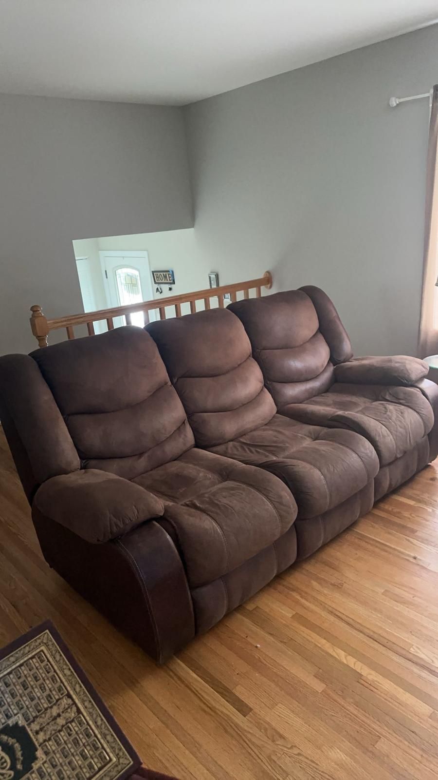 Premium quality reclining brown Sofa and 2 love seats Condition good and very fair to the price Priced very low because need the space ASAP
