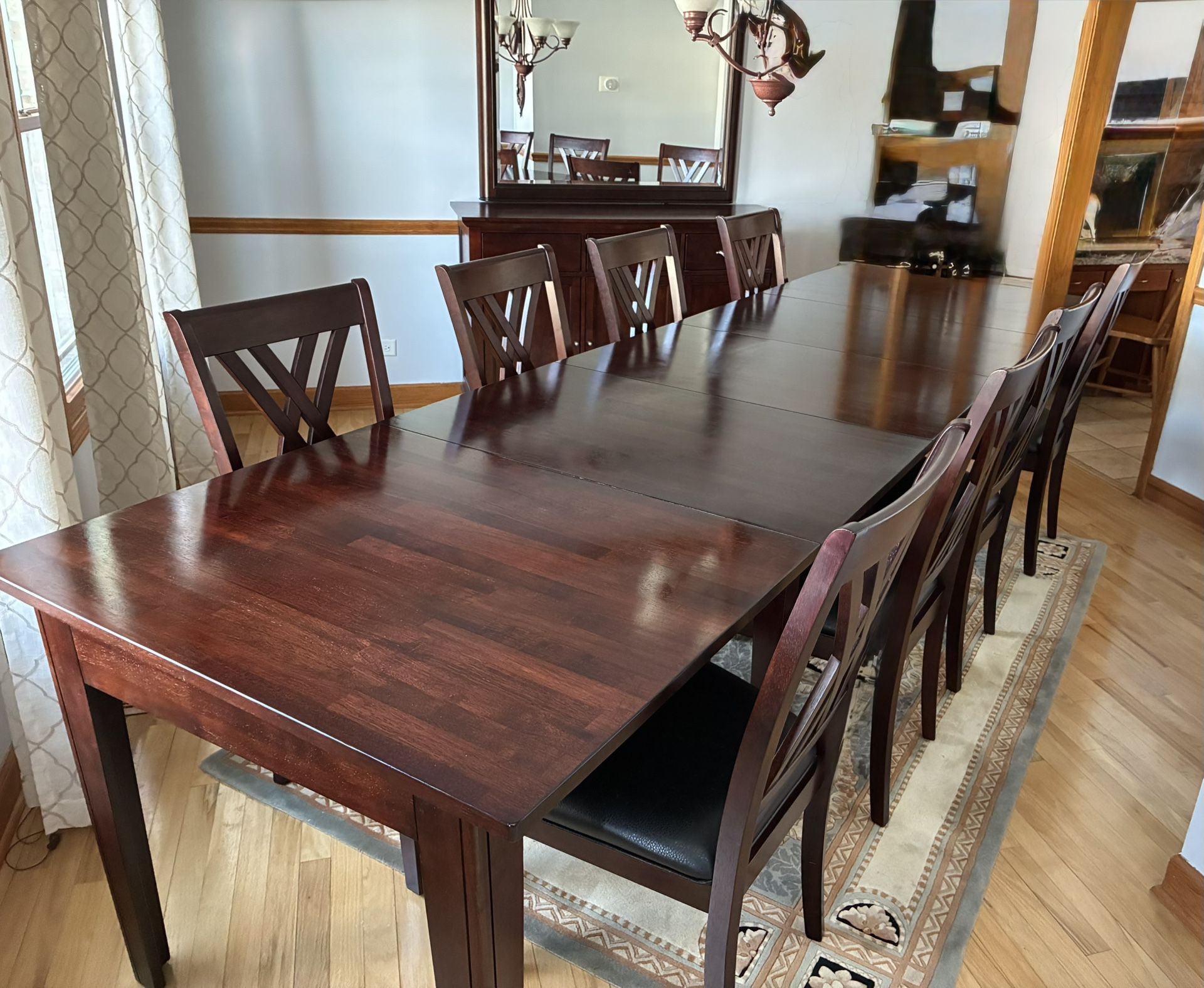 61” L x 38” W table that extends to 132” total length. Good condition and finish. 3 - 24” stored leaves. Good condition and finish. 8 chairs with seated cushions. Note- 4 chairs with seated cushion showing wear. 56” L x 17.5” W x 36” H Buffet Cabinet. Good condition and finish. 45.5” W x 39” H Mirror. Good condition and finish. No smoking, pet free home.