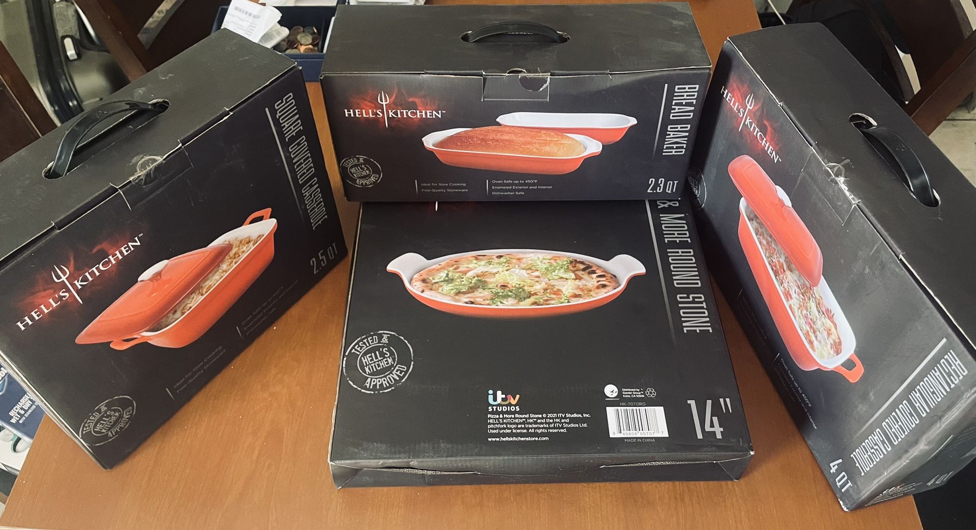 Hell's kitchen stoneware collection -Rectangular covered casserole 4 qt -Bread Baker 2.3 qt -Squared Covered casserole 2.5 qt -Pizza & More Round Stone 14”