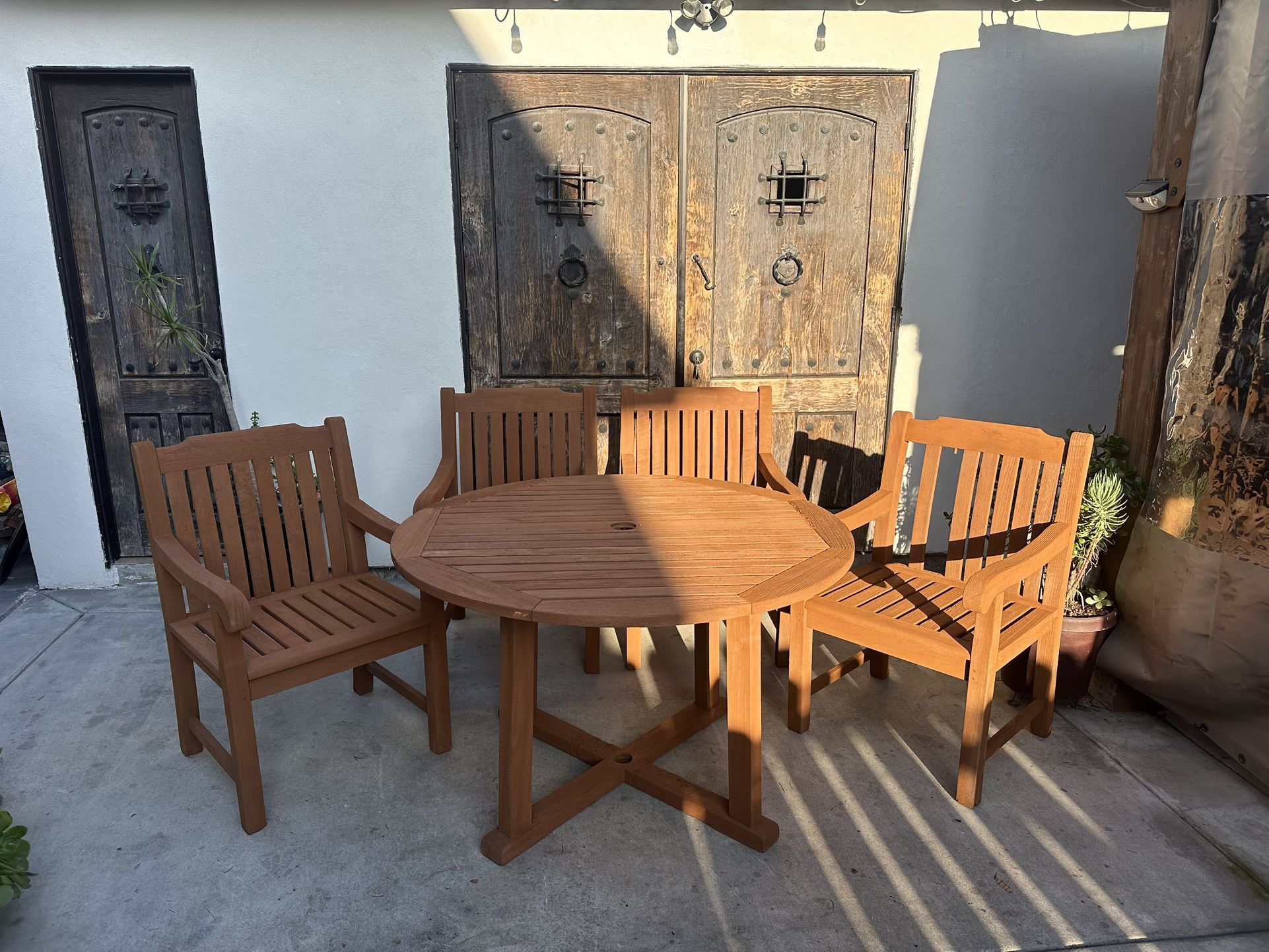 Teak patio set for sale Includes 4 chairs and a table. Painted and sealed. Table measures 48 inches across. Solid set, selling cheap because of wear. (See photos attached.) $400 cash only. No bank transfers accepted Pick up only. Located in chula vista