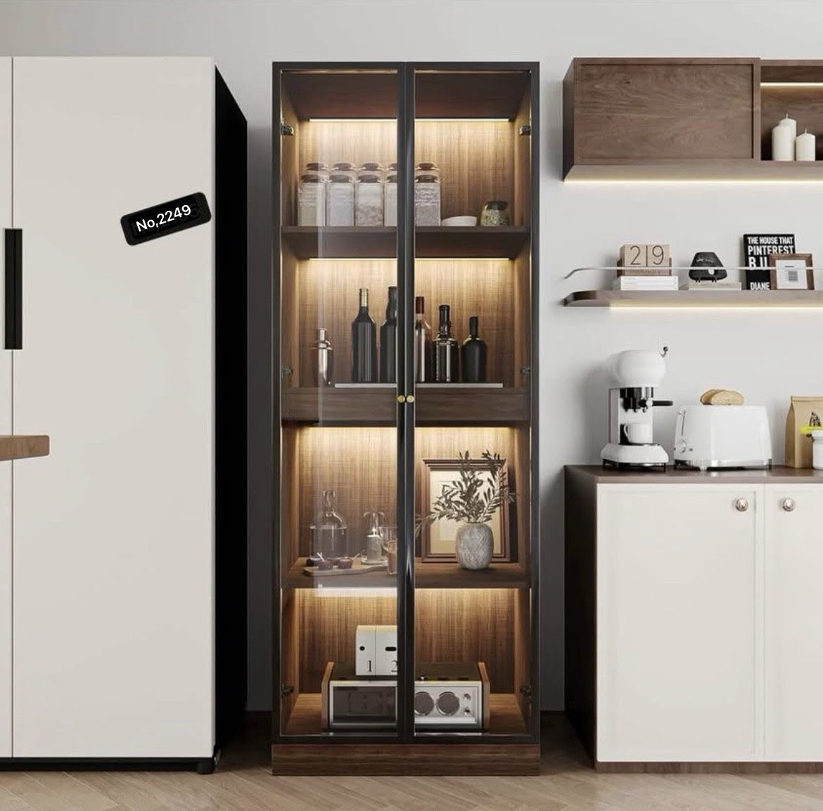 Modern Tall Glass Display China Cabinet with Lights and Glass Doors, Walnut Finish Dining Case with Hutch and Display Shelf for Curio Liquor Wine Stor
