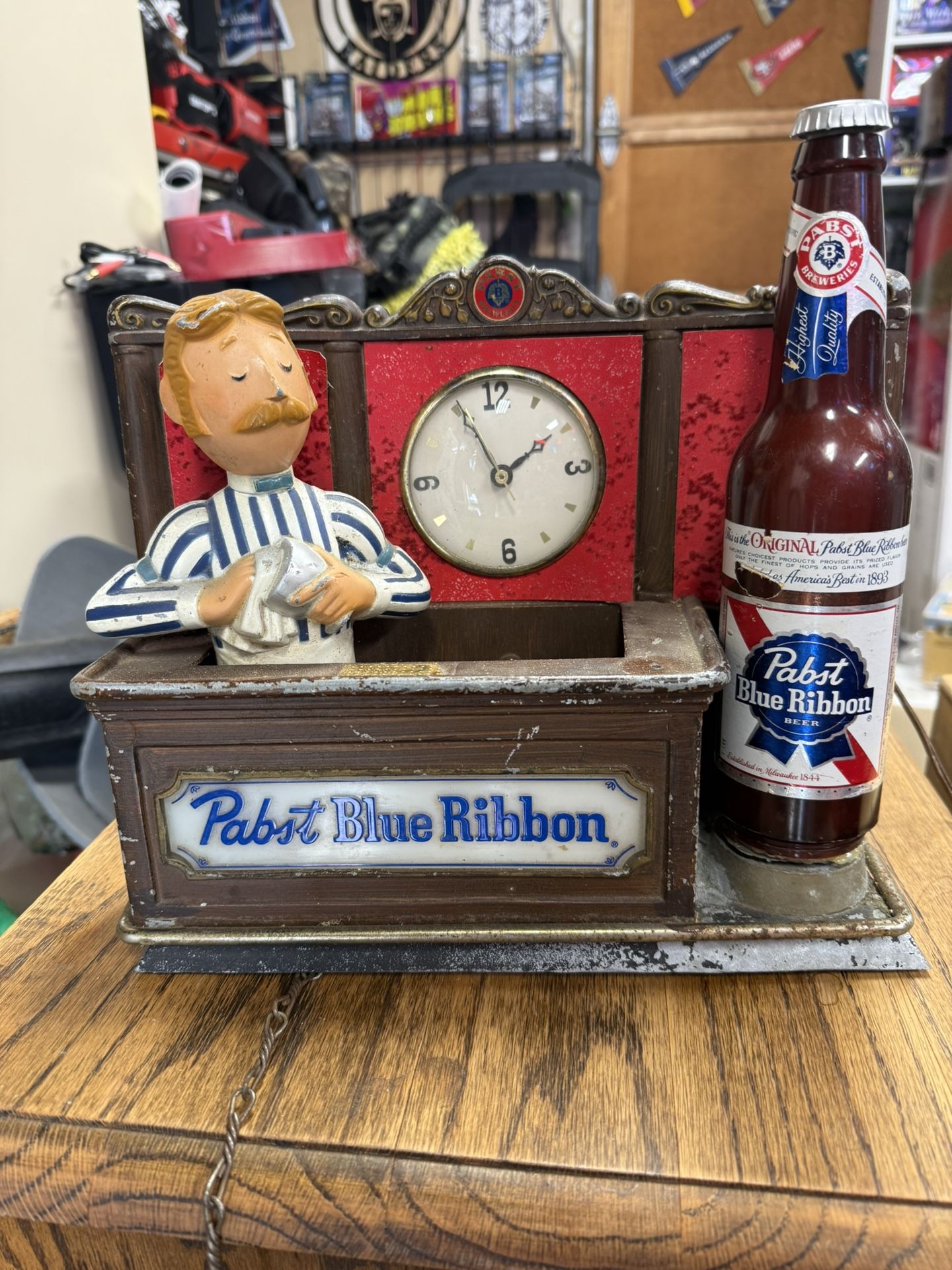 I believe this is from the 50s or 60s from what I have seen online . clock works and light works. The bottle is not perfect. It’s just glued onto the stand hot glued. That’s how I got it. In pretty good shape! Compare to prices on eBay!