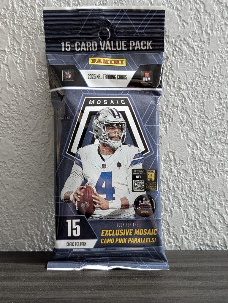 Factory sealed 2025 Panini Mosaic Football Cello Pack containing 15 cards. Look for exclusive Camo Pink Mosaic parallels as well. Have 6 available!