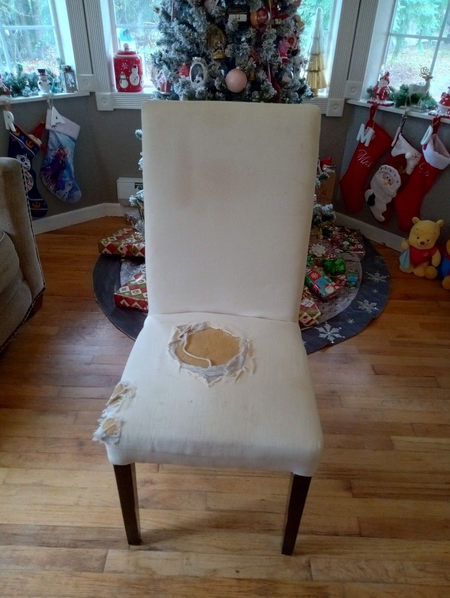 Foam intact. Ripped on the seat portion. I intended to reupholster, but don't have the time. If anything, buying a cover would work also.
