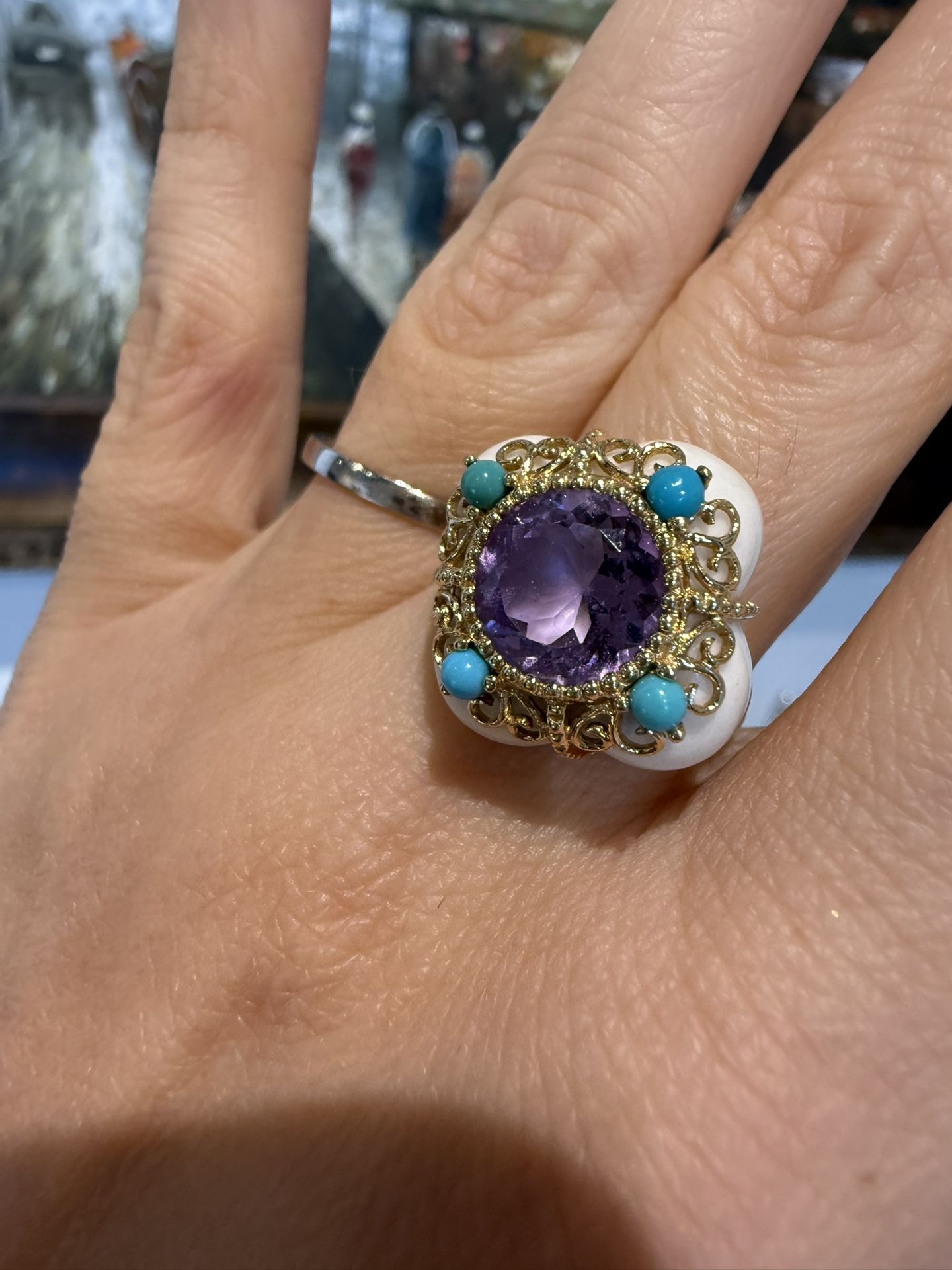14K Yellow Gold White Agate Amethyst And Turquoise Ring