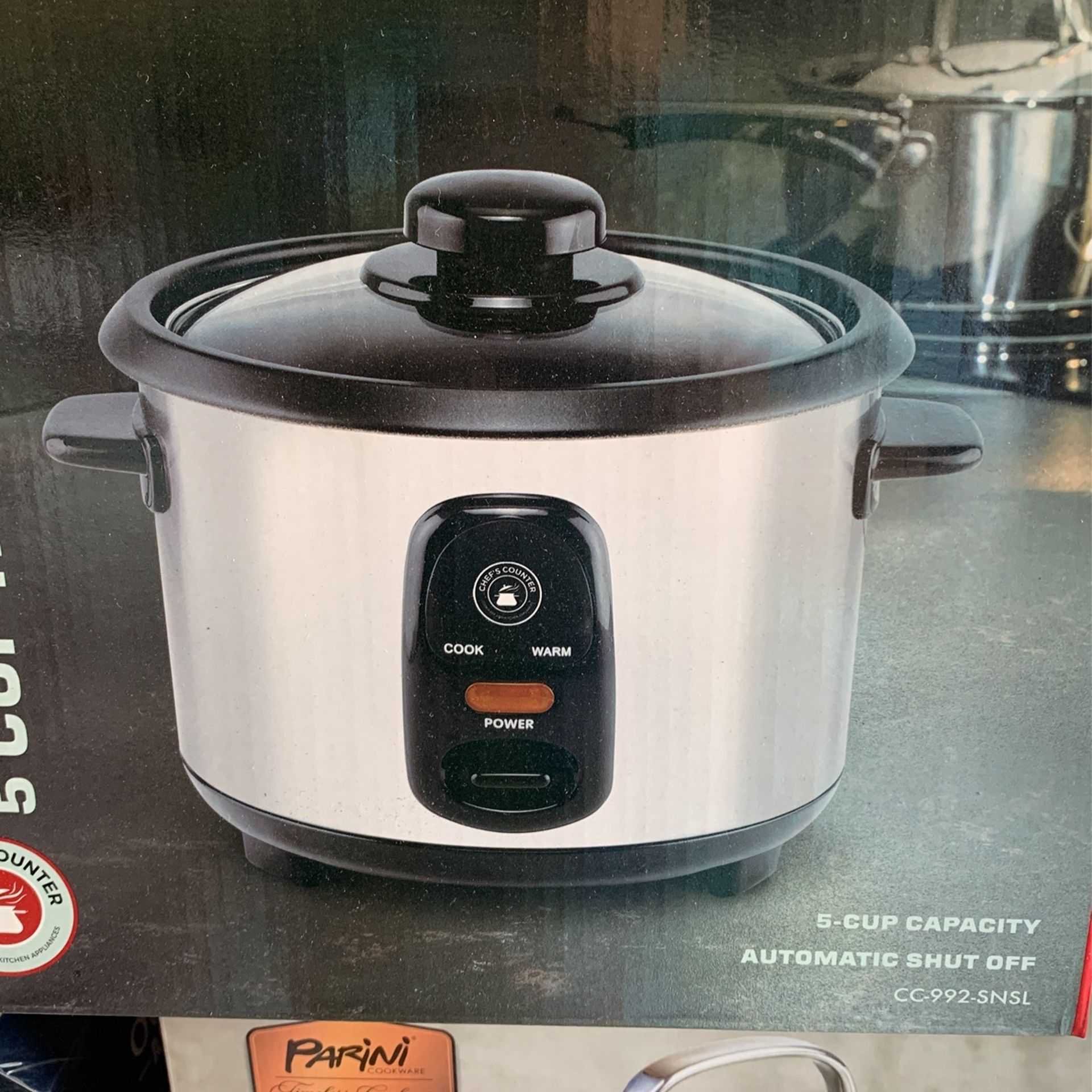 5 cup capacity automatic shut off lid with stem vent, removable cooking pot, cool touch handles.