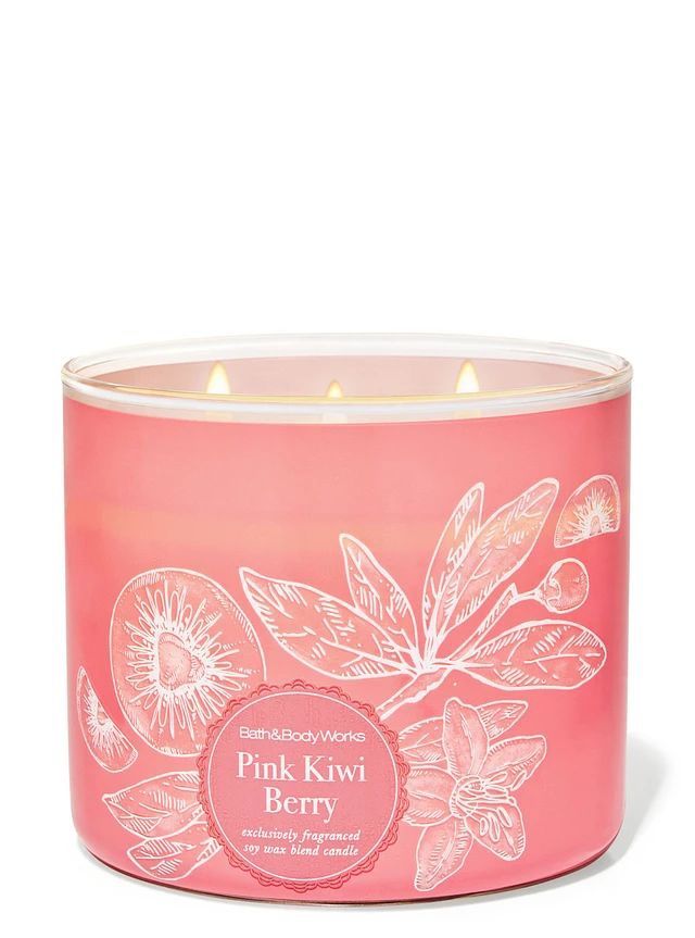 Bath & Body Works Pink Kiwi Berry 3 Wick Candle! What it smells like: Sweet kiwi, candied citrus and sunny orchids.