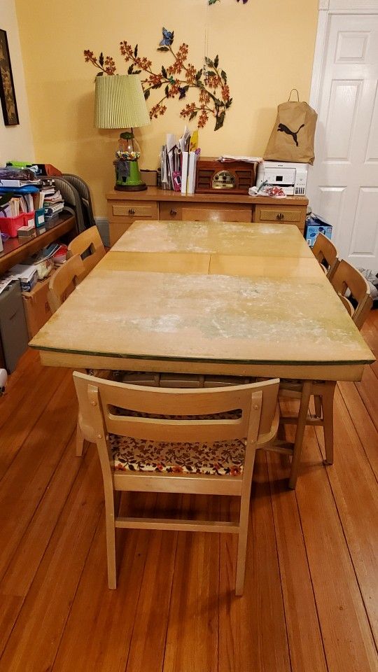 Dining table with six chairs. 3 leaf extensions to extend the table. Slight finish damage on table top. Chairs will need foam cushions replaced and upholstered. Has a matching Buffet with plenty of storage. You will need to bring your own truck/ moving van and load it yourself. It will require two to three people to move furniture.