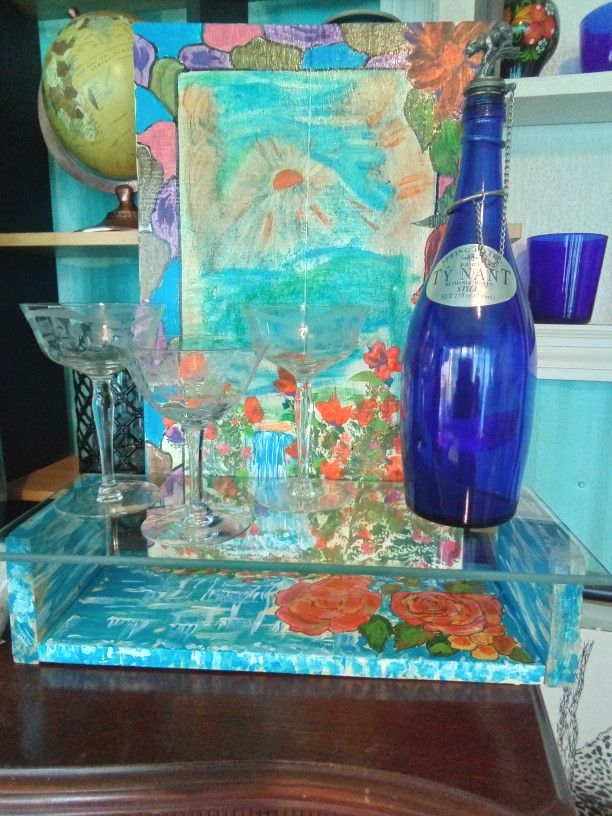 Small little stand. With painting,, n glass shelves good for bottle n glass for your bar,,to pick up at treasure mart eustis florida,,look for Laila booth,,on the back,,