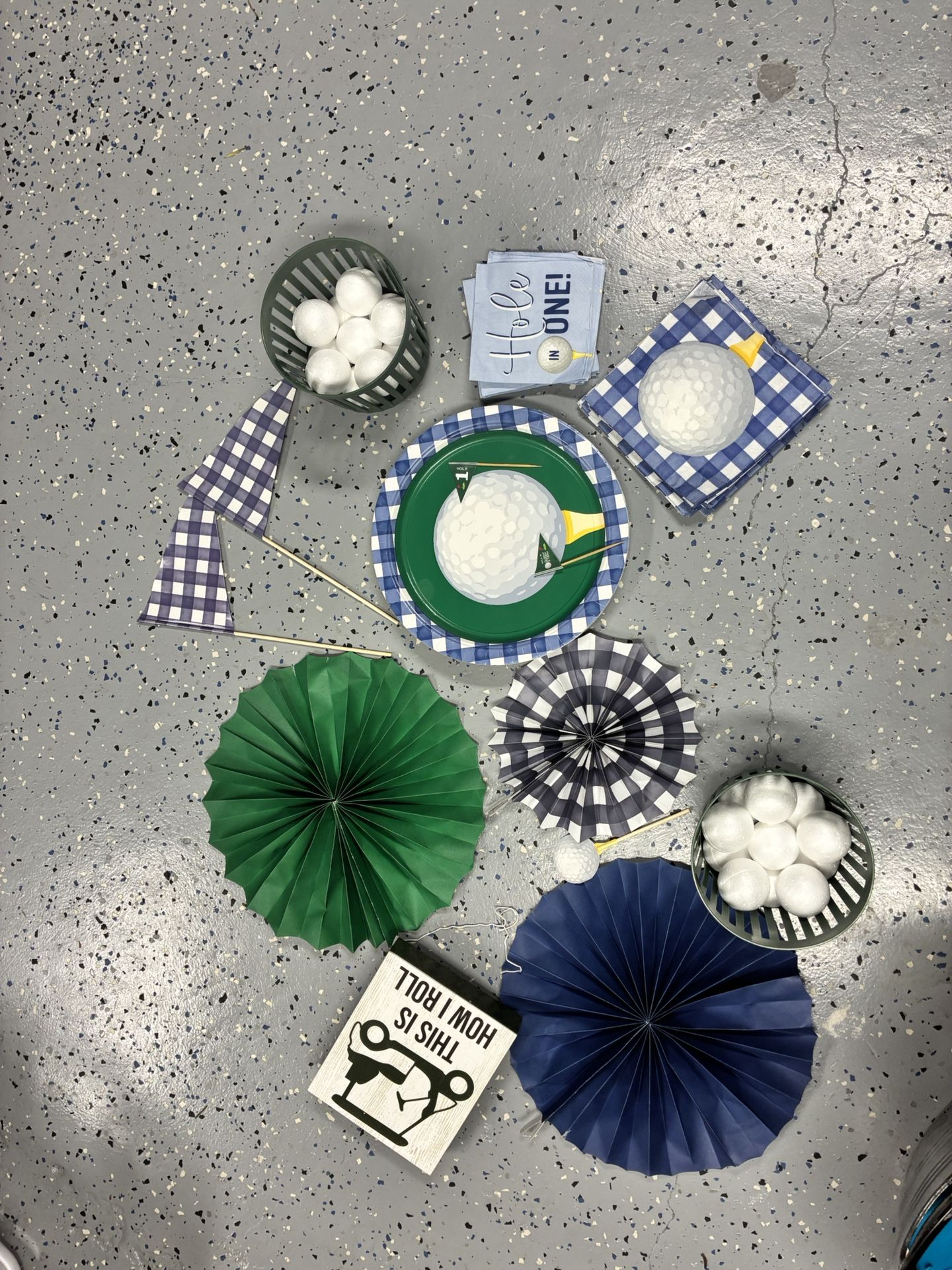 Used for a 1st birthday. Lots of decorations. 2 plastic golf bag sets. Foam visors. And more!