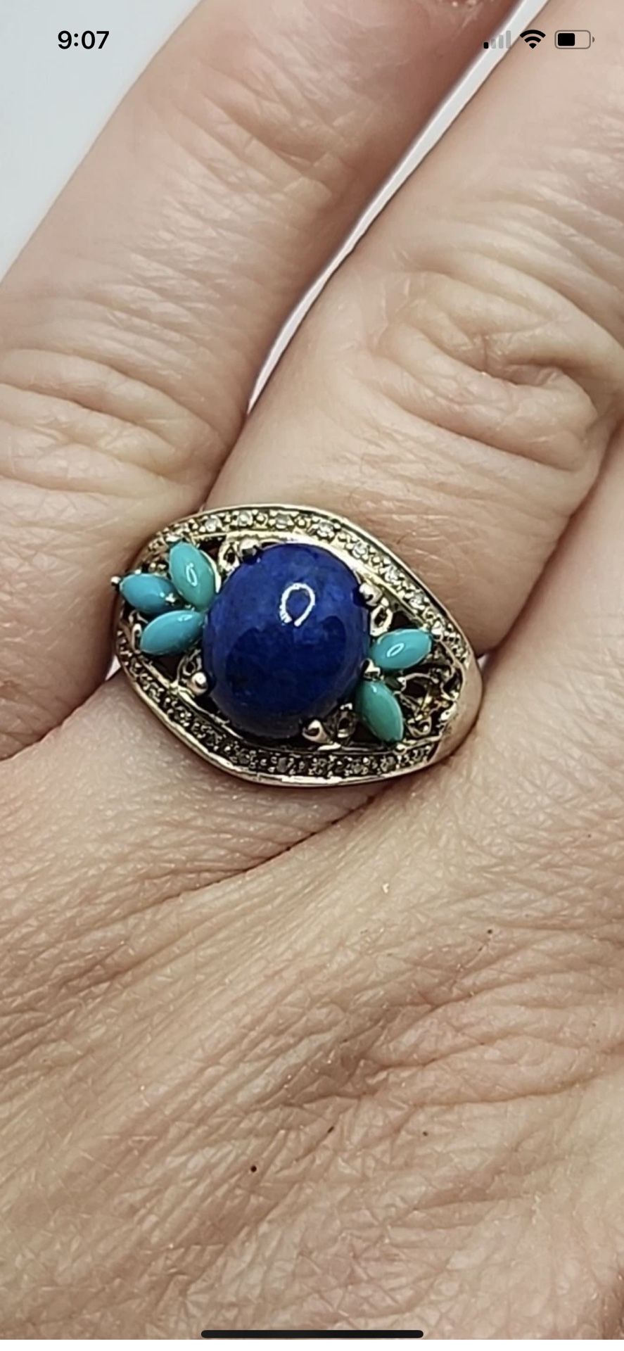 The Michelle Albala Sterling Lapis Sleeping Beauty Turquoise Sapphire Ring in size 6 is a stunning piece of fine jewelry crafted from sterling silver. The ring features a beautiful lapis lazuli main stone in a vibrant blue color, with secondary stones of turquoise and sapphire adding a touch of elegance. The design of the ring captures the theme of beauty, making it a perfect accessory for those looking to add a pop of color and sophistication to their outfit. This exquisite ring is sure to make a statement and is a perfect choice for those who appreciate unique and eye-catching jewelry pieces. Weighs 5.62g