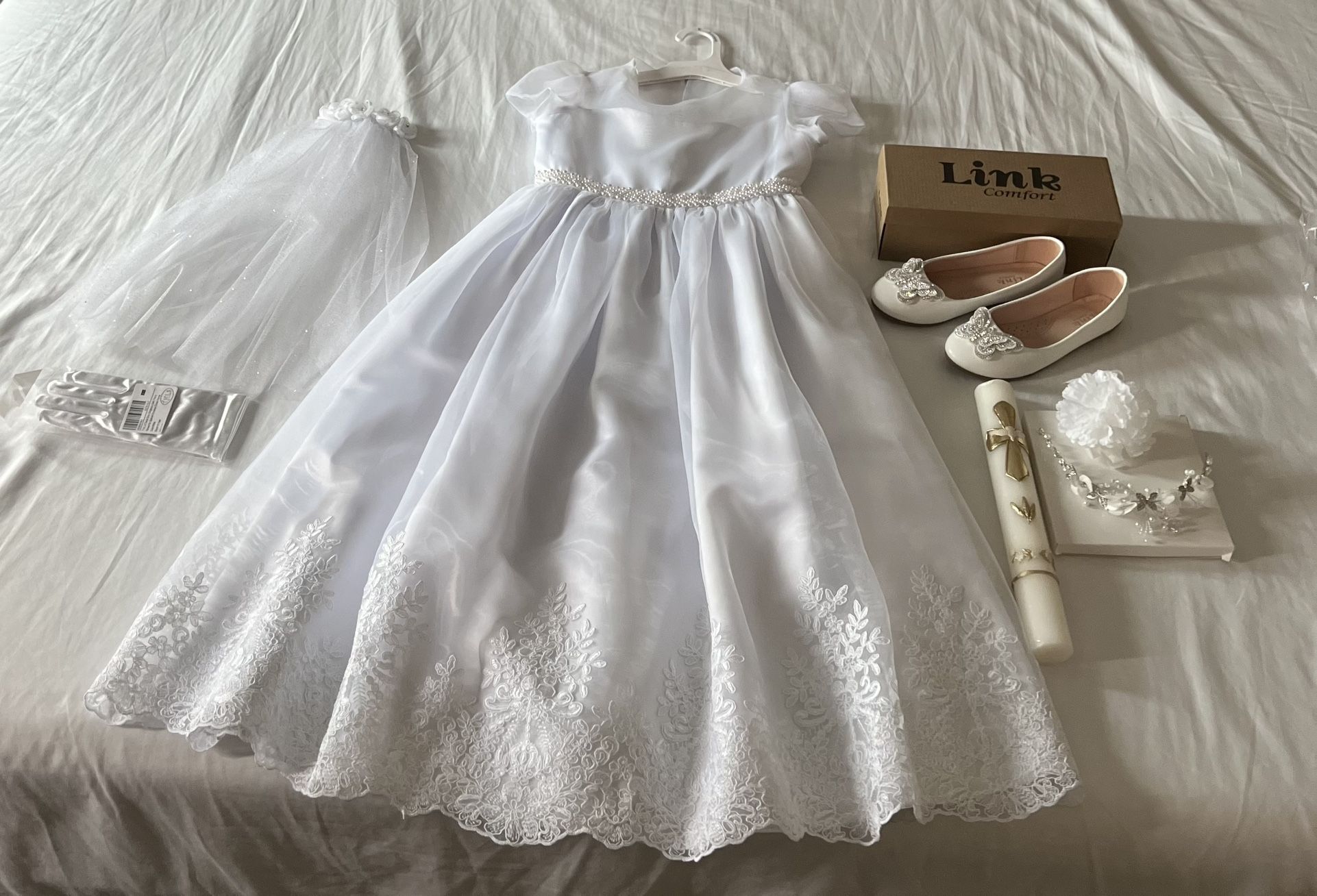 First communion dress size 10-12 Bonnie Jean from JCPenney, shoes size 2, gloves for girls 9-15 yr old, Hair flower set, Beautiful Candle,brand new, all for $75