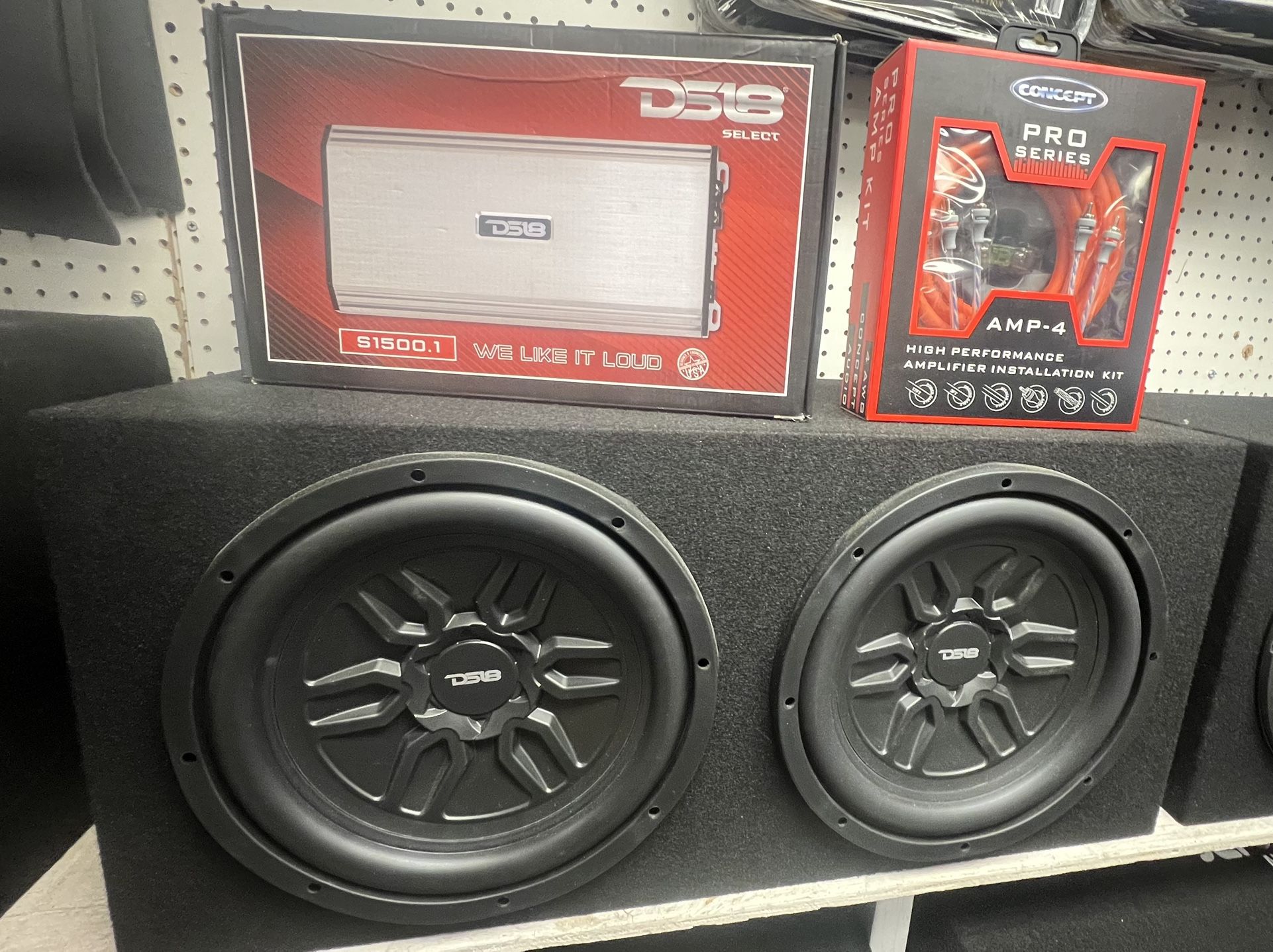 DS18 System .. brand new . 2-12” DS18 Subwoofers 1000 Watts each with enclosure box . DS18 1500 Watts Amplifier . Class D/ Monoblock . Bass Remote Control included . 4 gauge Wiring Kit . Brand new .. Special .. Only $499.00