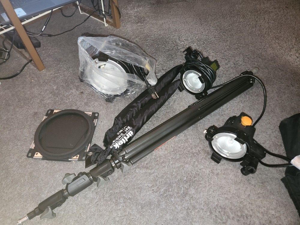 3 lights 3 stands 2 umbrellas 1 barndoor