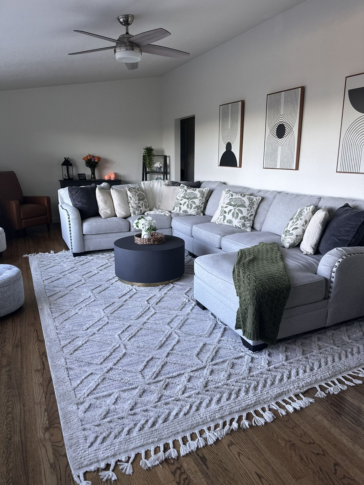 Large sectional for sale - Right facing chaise. 152 w but can take extra middle seat out if need something smaller. Corner side 97 in. and chaise side is 69. Needs a good cleaning but other than that it’s in great condition!