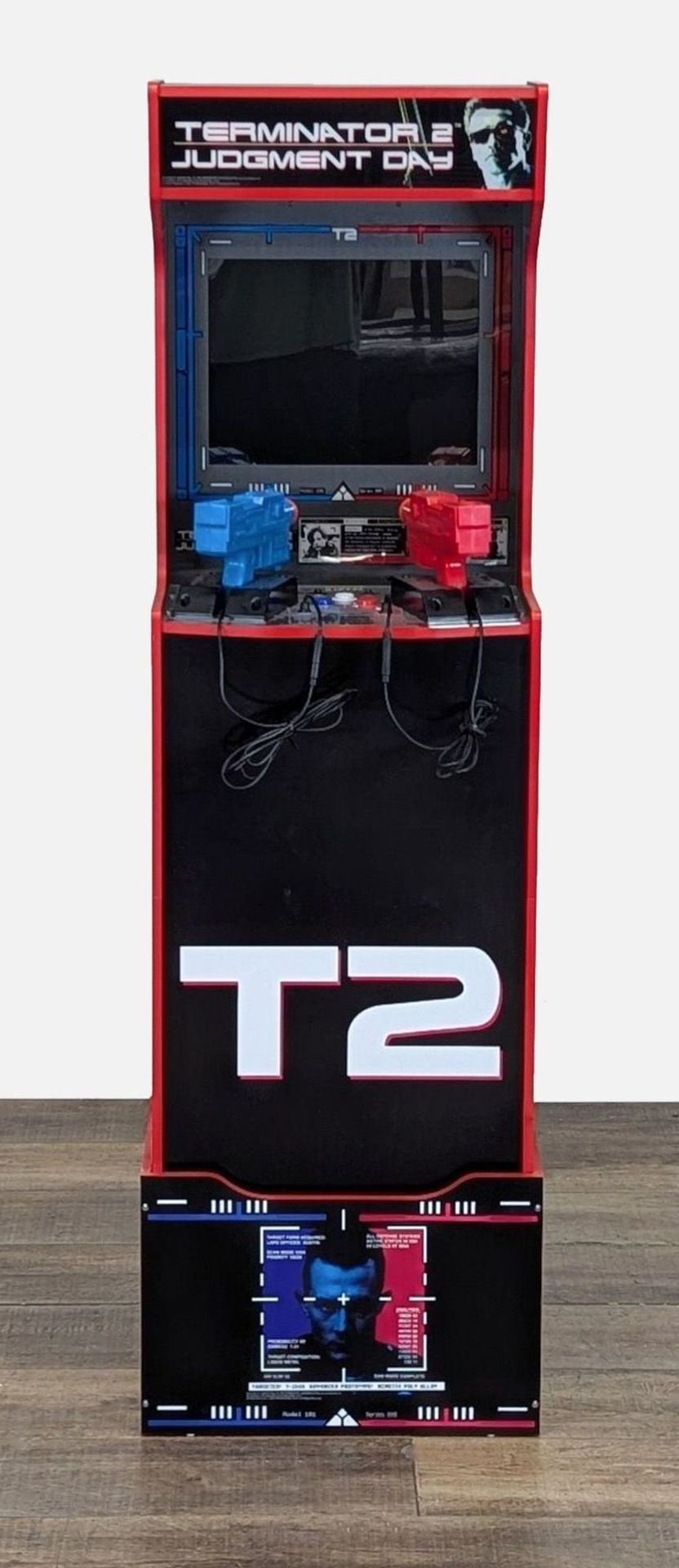 Used a handful of times and kids never played with it again. Excellent condition and works perfectly. Below are specs from mfr. Pick up in Woodbury. Step into a world where man battles against AI machine with the Arcade1Up Terminator 2 Deluxe Arcade Machine—a high-octane, action-packed revival that brings the iconic Terminator 2 universe to life in Arcade1Up’s iconic Deluxe format. As we face the rise of AI in our day to day lives, relive humanity’s last stand against Skynet in this one-of a kind tribute to both the Terminator 2 franchise and the legendary arcade video game. Take control of earth’s destiny with real-feel Arcade light guns, and fire with deadly precision as you obliterate swarms of T-800s and battle the relentless machines sent through Skynet’s AI. The 17” BOE color monitor delivers vivid, explosive visuals that make every chase and showdown feel like you’re part of the action, while dual speakers immerse you in the heart-pounding chaos that surrounds you. It’s not just gameplay—it’s a cinematic experience, putting you face-to-face with the potential future of AI. This machine is a true masterpiece for fans of the film, the game, and anyone fascinated by the AI-driven world we live in. This detailed cabinet, features apocalyptic Terminator 2 artwork and a glowing Light-Up Marquee, bringing back the golden age of arcades with a modern twist. Plus, enjoy the exclusive behind-the-scenes footage of the game’s creation, offering a deeper dive into one of the most iconic arcade experiences to go from the big screen to your at-home arcade. Whether you’re reliving the classic video game you remember or discovering it for the first time, this machine isn’t just about playing—it’s about experiencing the ultimate battle between man and AI machine. Ready to fight for the future of mankind? Don’t miss your chance to own a piece of cinematic and arcade history and fight back against AI—order the Terminator 2 Deluxe Arcade Machine today before Skynet takes over! This product is protected by U.S. Patent No. #11,383,175 and #10,751,632 Classic Game & Behind-the-Scenes Footage Experience the iconic game that started it all, along with exclusive behind-the-scenes footage that provides an in-depth look into the making of this timeless classic. Over 5 Feet Tall Standing at an impressive height, this full-size arcade machine commands attention while fitting seamlessly into your home arcade setup. 17” BOE Color Monitor Enjoy a vivid and sharp display on the 17-inch BOE monitor, designed to bring every detail of the game to life with rich colors and brilliant clarity. Dual Speakers for Dynamic Sound Immerse yourself in the action with crisp and dynamic sound. The dual speakers deliver every sound effect, track, and audio cue with precision and clarity. Wi-Fi Online Leaderboards Compete with players worldwide and see how your skills stack up. With Wi-Fi connectivity, challenge friends or rivals and climb the leaderboards in real-time for endless competitive fun.