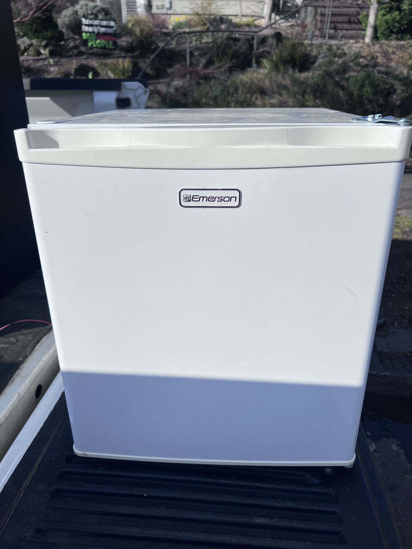 Emerson compact mini refrigerator (model CR170WE). ✅ Works and cools ✅ Clean interior ✅ Includes shelf and drip tray ✅ Great size for office, bedroom, garage, or dorm Small freezer compartment inside for ice packs. Normal light cosmetic wear from use (see photos). Priced for a quick sale. Pickup:Near NE Portland / flexible meetup Message if you want to see it plugged in 👍