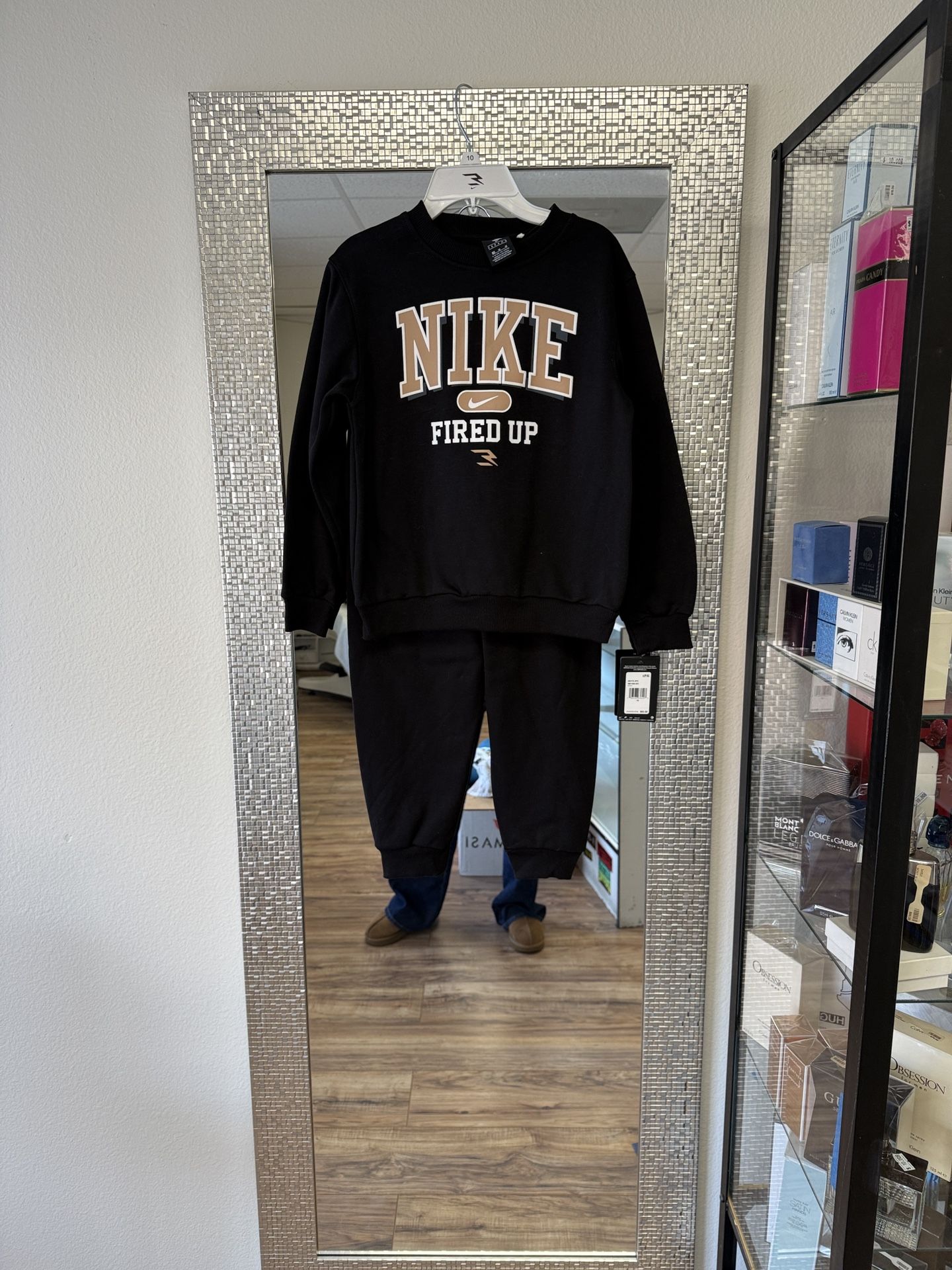 Nike tracksuit with bold 'Fired Up' print. Cozy and trendy.