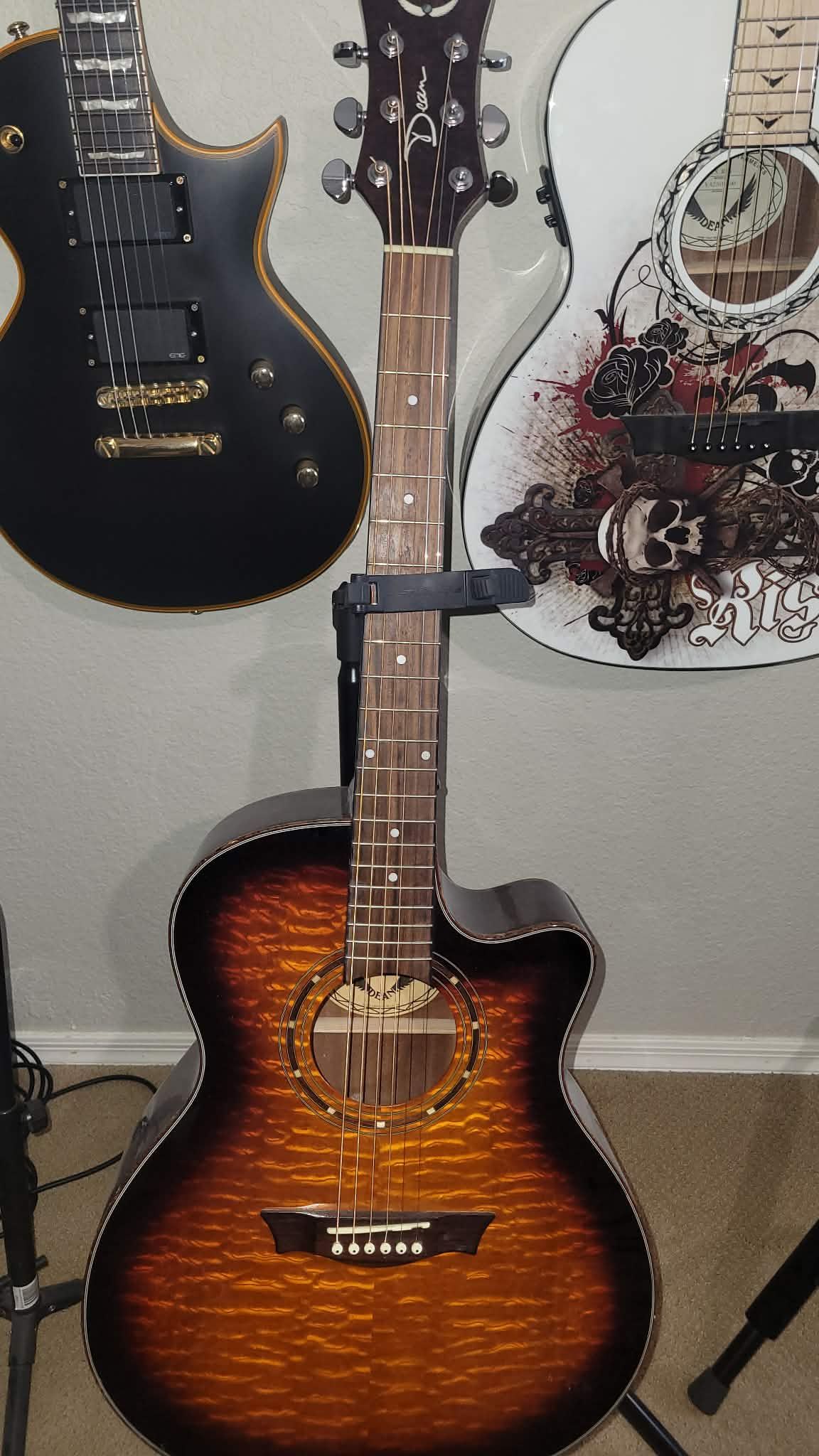 🎸 Dean Exhibition Acoustic-Electric (Cutaway) Price: $250 OBO Dean Exhibition acoustic-electric guitar with cutaway. Sounds great unplugged and plugged in. Built-in electronics and tuner. Clean condition. Excellent beginner or casual player guitar. Perfect for Christmas or learning acoustic.
