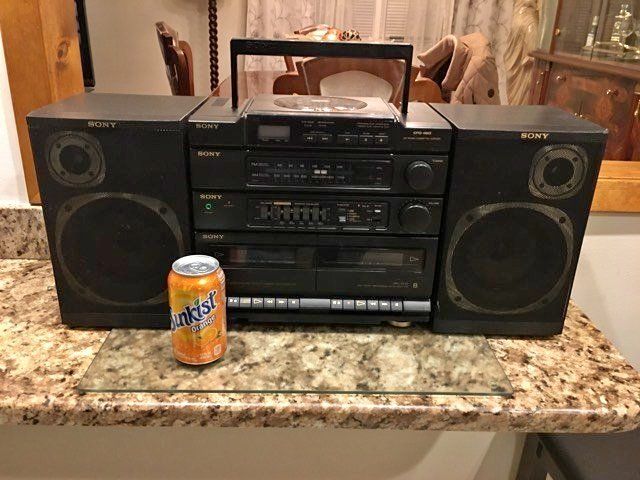 33 year old Sony CFD-450 AM/FM/CD Dual Cassette Ghetto Blaster Boombox with Detachable Speakers. Vintage 3rd generation 90’s ghetto blaster boom box. Massive size. Shown here with a can of Sunkist for comparison. 27” long and 11” tall. It is the definition of 1990’s vintage. Over 36 years old. Powers on and radio plays. I know nothing more. Was left in the garage by former tenant that owes 3 months back rent. I know NOTHING more about it. What you see is what I know. Sold "as is" and "as seen". You can pay $88 or pay the back rent.