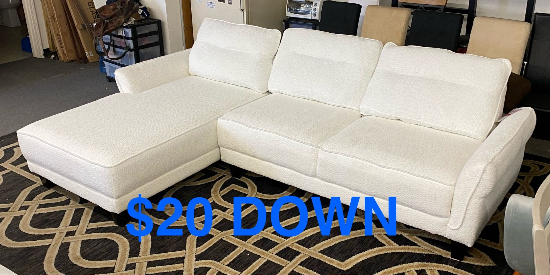 Brand New White Fabric Classy Sectional Sofa 110 x 68 x 36H AFFORDABLE PRICE GREAT QUALITY Free delivery Only $50 down! Financing available with Zero Interest on 90 Day payoff. (Easy to qualify) No Credit Needed! Can text you an application to your cell phone for immediate approval. WHEN YOU CHOOSE TO BUY FROM US; • Same/Next Day Delivery on most items. • Direct factory distributors - Pay for the item, not the overheads! • Cash / Venmo / Zelle / Cash App / Credit Card on delivery - Upfront Payment Optional.