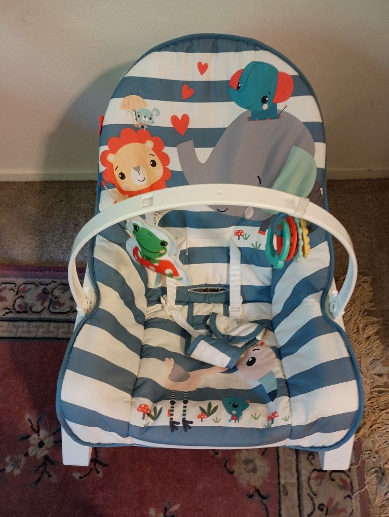 Baby Bouncer with designs is in Great Condition. It's very nice and comfortable. It has the option to put the back rest down so the infant can rest better.