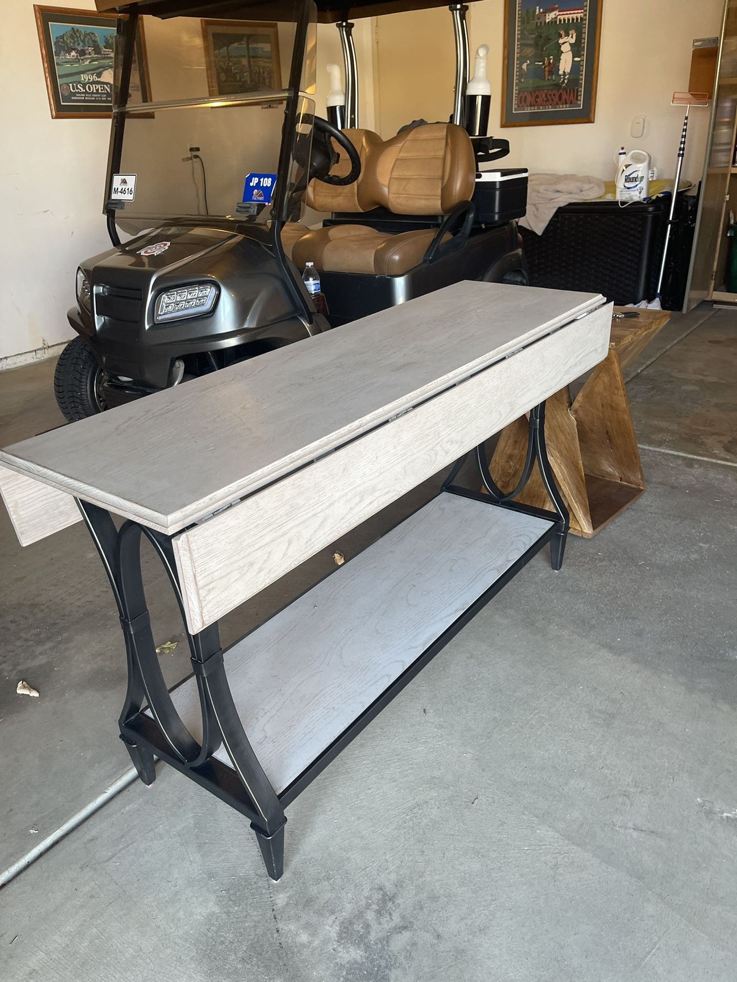 Grey distressed finish. Like Restoration Hardware. Bought at Mathis Bros.