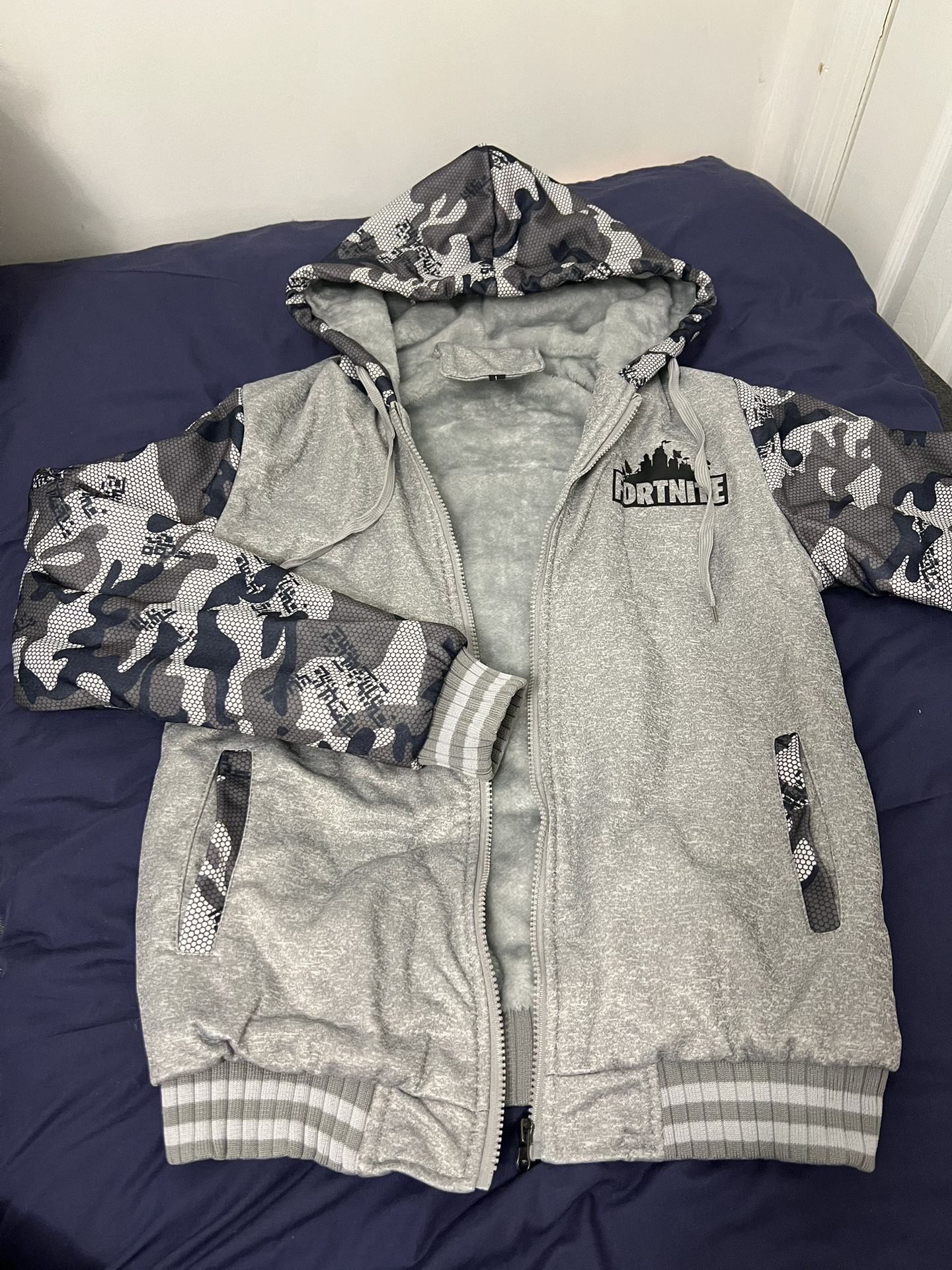 Men Winter Jacket with Fleece Lining – Warm Hoodie Coat, Full Zip, Gray PLEASE READ SIZE INFO – THIS JACKET RUNS SMALL. Size :Small Size conversion (important): • L = US Small • XL = US Small / Medium • XXL = US Medium • 3XL = US Large Please check size carefully before purchase. Features: • Thick fleece-lined interior (very warm) • Full zip front • Hoodie with drawstrings • Gray color with camo-style sleeves • Ribbed cuffs & hem to block wind
