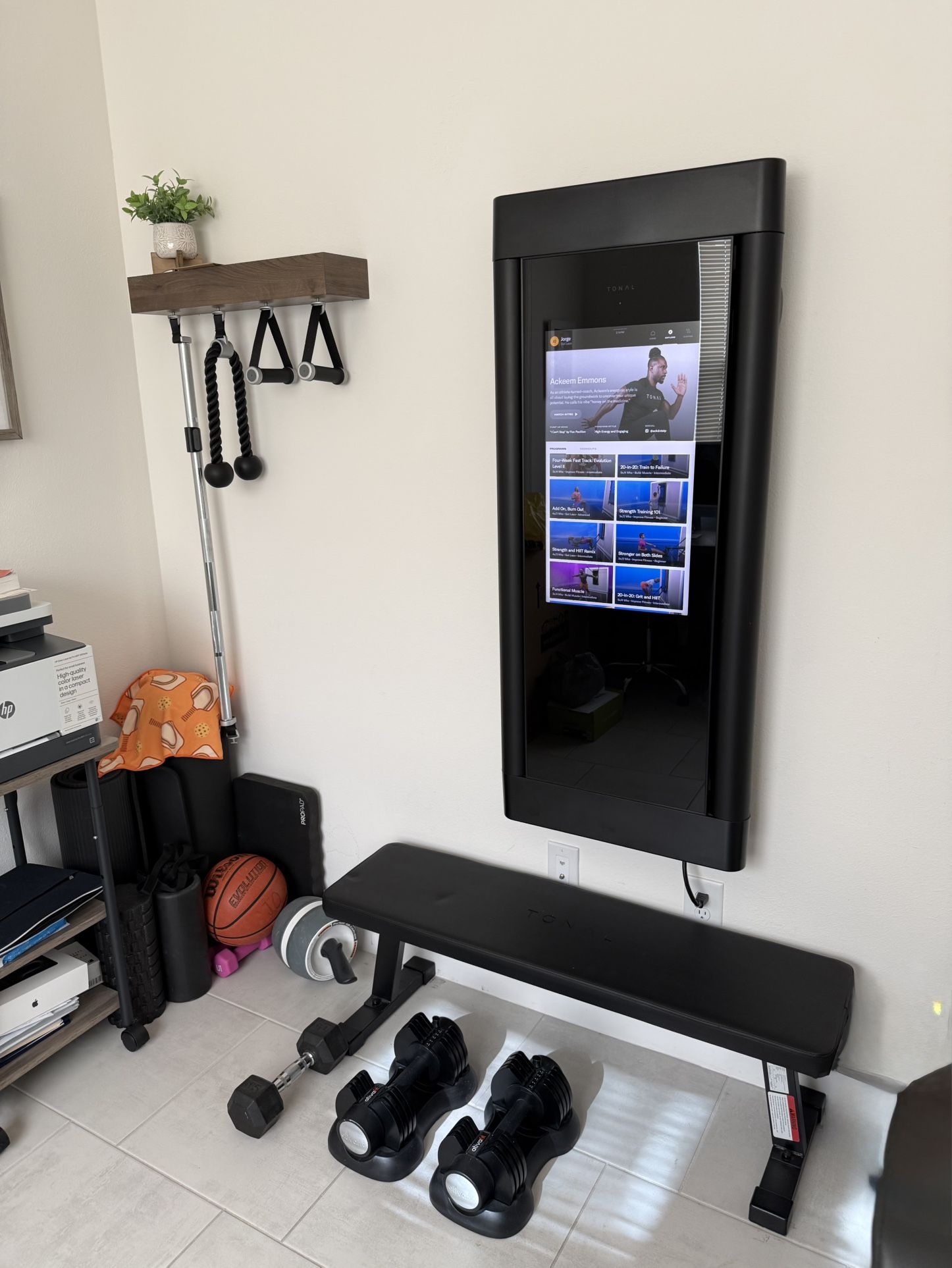 Selling my Tonal smart home gym. This unit is in excellent condition and like new. Just selling it because I’m moving to a place that I can’t have it. Includes: • Tonal wall-mounted smart gym • Original Tonal adjustable bench • Full Tonal accessory set (smart handles, rope, bar, etc.) • Premium solid wood wall-mounted accessory shelf/rack to keep everything organized and off the floor