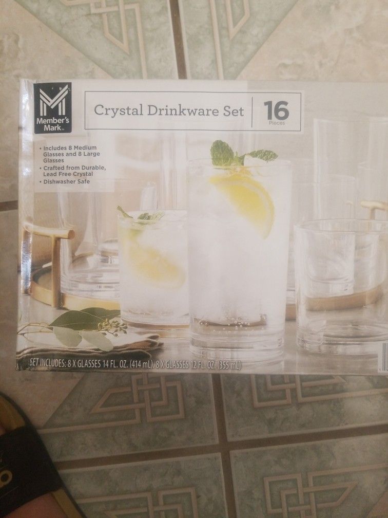 8 Medium Glasses 8 large glasses Crafted from durable lead free crystal Dishwasher safe. Must pick up. Typically $35 + tax. I'll let it go for less.