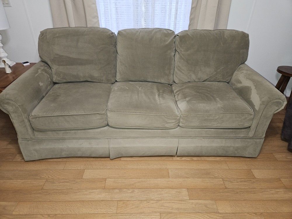 $40 Sage green couch. Smoke free, dog friendly home -No pets on couch. Good quality. 80L x 35Hx 34D