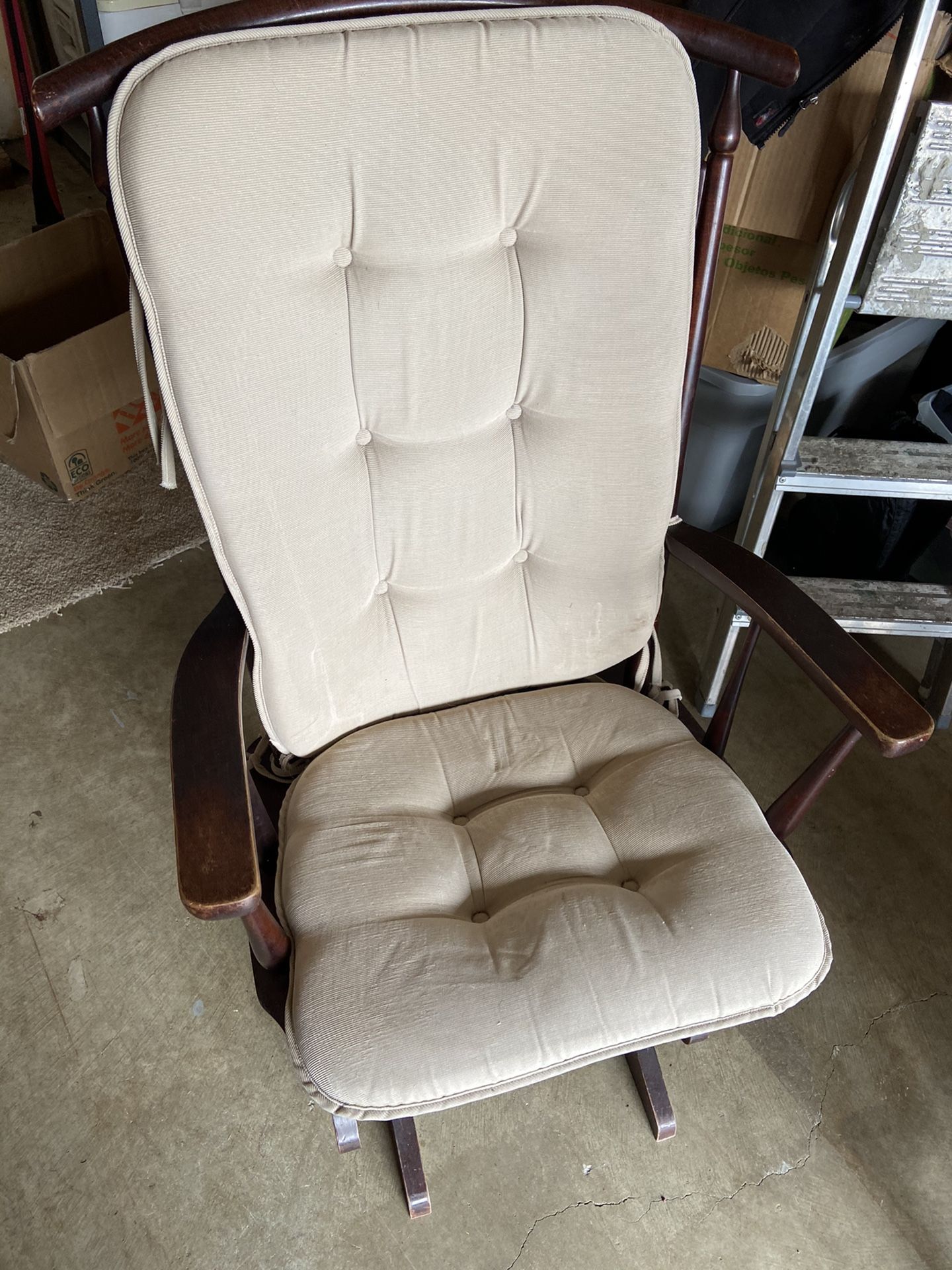 Glider rocker. Works fine. Varnish and stain is rubbing off on the front handles.
