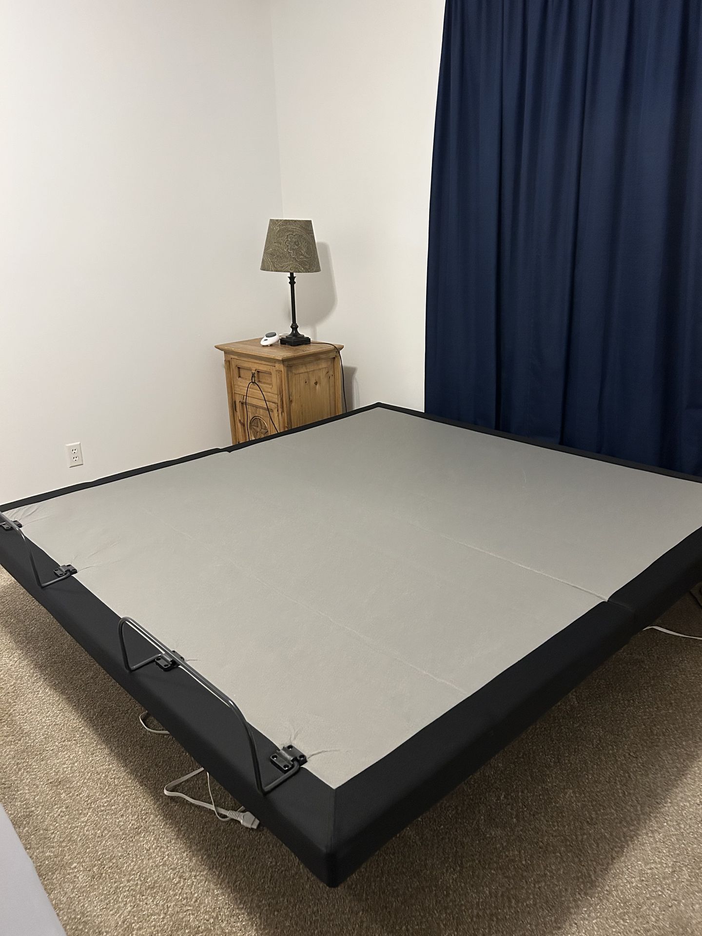 Taking Best offer for a King sized adjustable bed frame, works great. No fragrances, smoke or pets. The base adjusts in all settings, remote is fully functioning: zero g, lounge, tv. It has a vibration setting, a light beneath, a flashlight. It’s mainly been used as a base so it’s not worn out at all. Cash only and it must be picked up. Measurements for base 75” x 78”. (Purple mattress available but it is also used. Been in a zipped mattress cover with another cover as a guest bed. No fragrances, no smoke, no pets. The mattress is free if anyone wants it.)