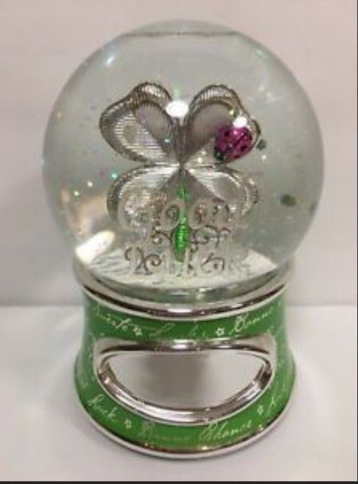 Beautiful Things Remembered musical water globe that has a 4 leaf clover with a lady bug on it. Says "Good Luck" & comes with 2 plaques that can be personalized with an engraving. Plays Annie Laurie.
