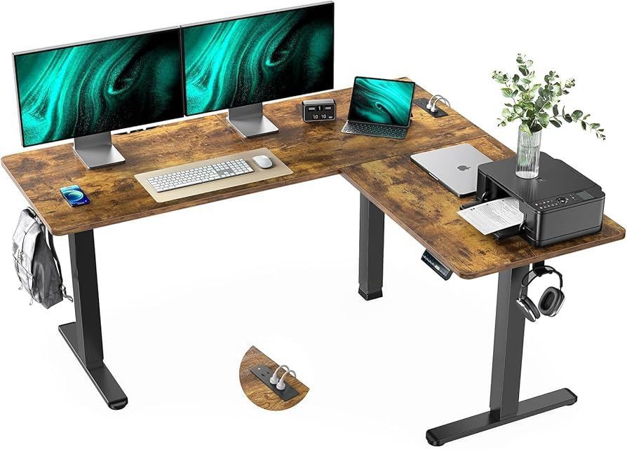 DK38 $120 63×55 in Electric Corner L-Shaped Standing Desk with 4-in 1 Electical Outlet, Computer Desk with Headphone Hook, Memory Sit Stand up Home Office Table, Ergonomic Gaming Table,Brown Shape L-Shape Desk design Standing Desk Product Dimensions 62.99"D x 55.12"W x 28.35"H Color Brown Style Classic Roomy L-Shaped Design for Daily Use:This L-shaped electric standing desk has a large surface, giving you plenty of space and flexibility for your home office or Workstations. You can neatly place dual monitors, a laptop, a printer, and other office things on this ergonomic desk—it works great as a computer desk, office desk, or home office desk that fits how you work. Easy Height Adjustment for Sit Stand Needs:As a height adjustable desk, this stand up desk lets you pick any height from 28.3" to 46.5", which is perfect for anyone who needs a sit stand desk. You can save 4 favorite heights and switch between them smoothly, helping you change postures and get more work done each day. Strong & Steady Build:The adjustable height desk has a tough solid steel frame and aerospace-grade lifting column connectors. Even when it’s at the tallest height, this adjustable desk stays steady and secure, giving your devices a firm base. No more wobbles or distractions with this reliable standing desk. Built-In Power & Long-Lasting Use:This computer table has a desktop power outlet (2 AC outlets + 2 USB-A ports), so you can plug in all your devices easily. Its motor uses high-tech worm gear, and the adjustable standing desk has passed 50,000 lift tests—proving it’s durable for everyday use. 5-Year Warranty for Worry-Free Use:We back this electric standing desk with a 5-year warranty, so you can use it with confidence. Whether you need an office desk, home office desk, or computer desk, this height adjustable desk mixes functionality, sturdiness, and ergonomic design to make your work better. b030134