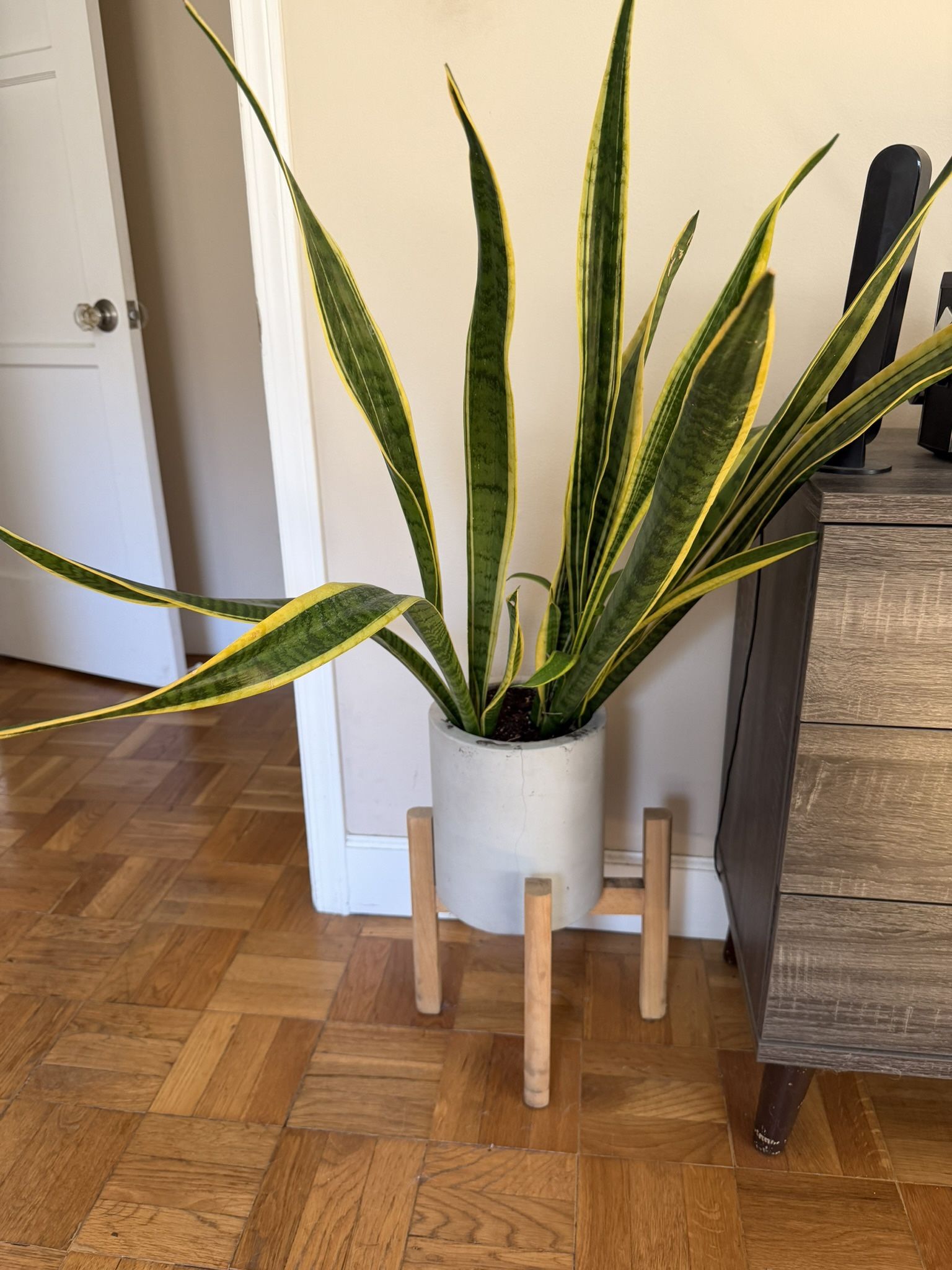 Large healthy snake plant (Sansevieria) in modern white planter with wood stand. Super low maintenance and air-purifying. Makes a great statement floor plant. Includes plant + pot + stand. No low ballers. No trades.